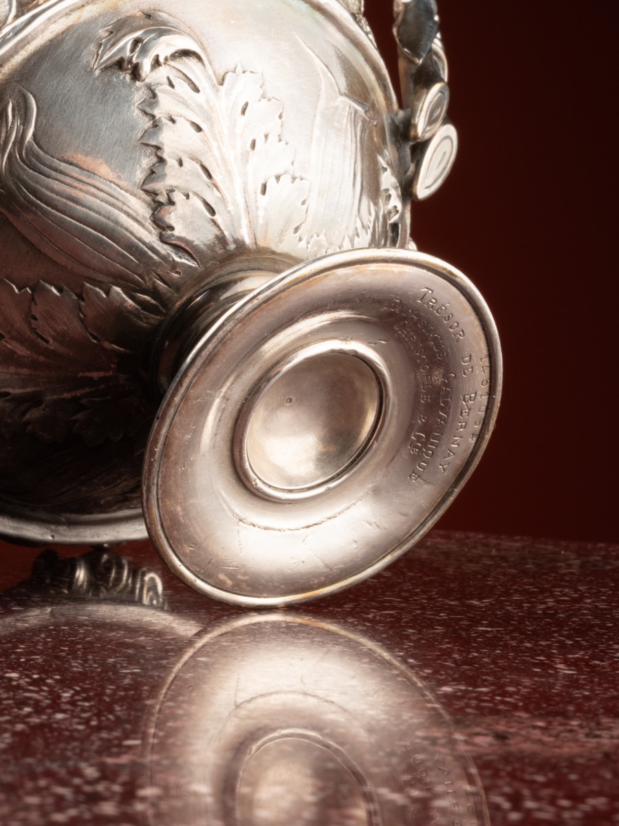 L’édition du trésor de Berthouville étant largement antérieure à la publication par Ernest Babelon de la dédicace à Quintus Domitius Tutus, tracée au pointillée au-dessous de la lèvre du vase, cette dernière n’est pas ici visible. Les parties mutilées sur l’original, conservé au Cabinet des Médailles de la Banque National de France, sont corrigées sur l’édition par Christofle.