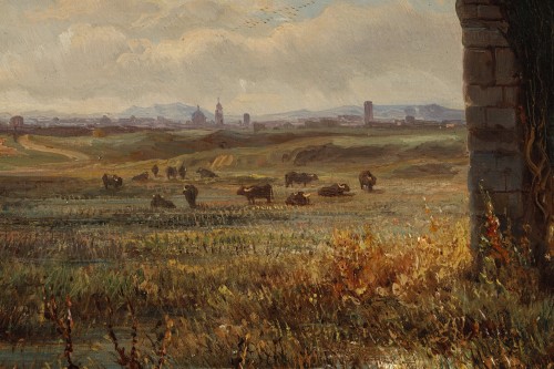 On y voit les ruines de l'aqueduc, vestige d'une grandeur passée, trôner au milieu d'une grande plaine dans les alentours de Rome représenté au loin. Le ciel nuageux semble agité et changeant laissant transparaitre ...