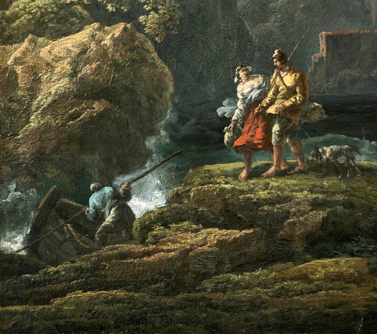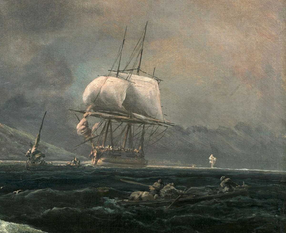 Dans des formats plus classiques le tableau présenté par la galerie Cailleux en 1986, Tempête au large d'une côte rocheuse (Signé et daté Carlo Bonavia P.A 1757, toile, 119,4 x 155 cm), est celui qui reproduit le plus de rapprochements, détails des personnages et des végétations, facture de la mer et des bateaux.