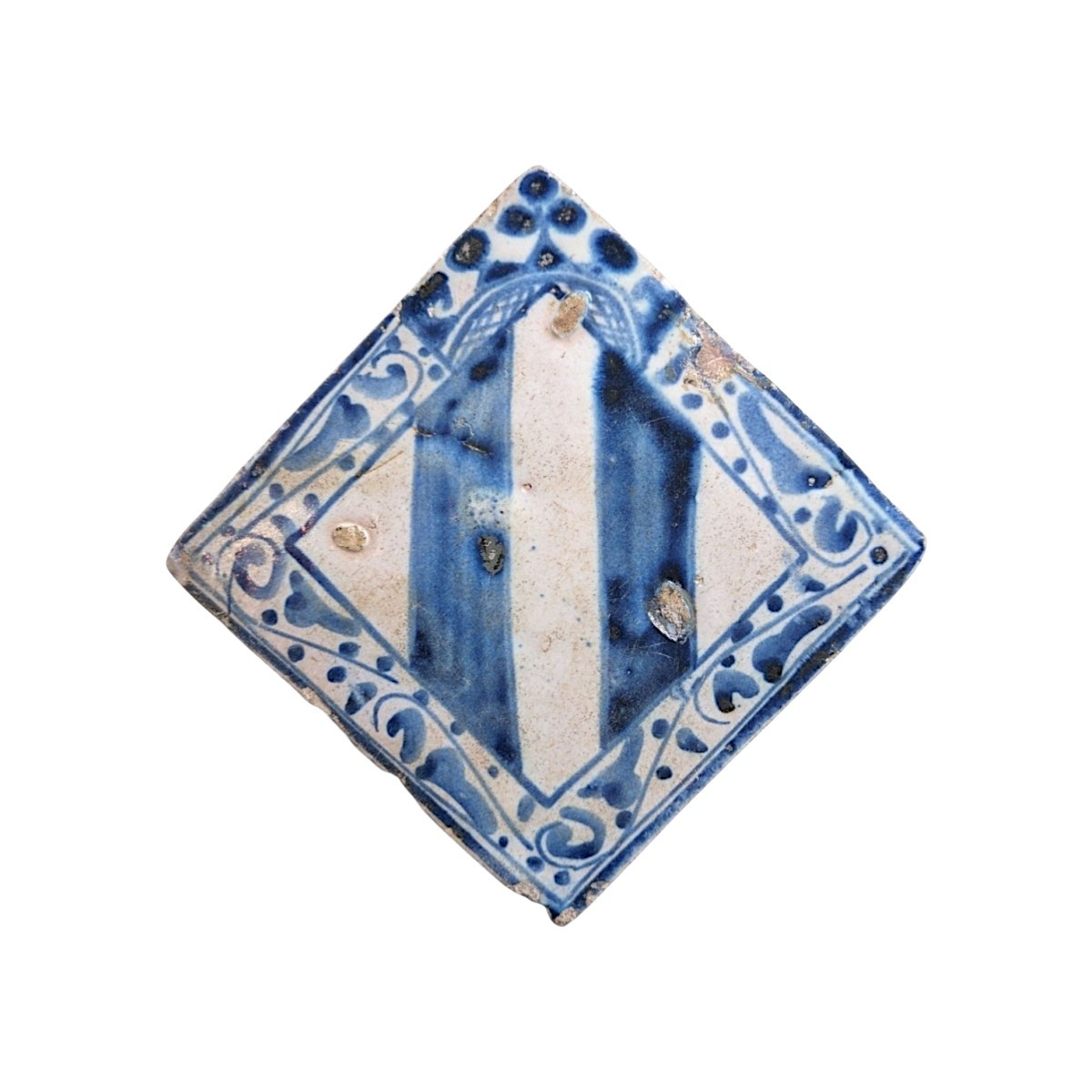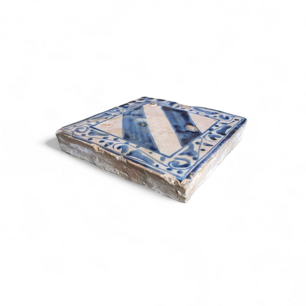Superbe carreau héraldique en excellent état, représentant les armoiries de la ville de Valence, probablement issu de l’ancienne « Casa de la Ciudad » (Hôtel de Ville), démolie au XIXe siècle. De forme losangée, il présente en son centre deux pals verticaux surmontés d’une couronne, encadrés d’une bordure de rinceaux aux tiges élancées portant feuilles et points.