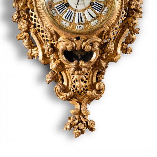 Retrouver le mobilier ou les objets d''art similaires à « Cartel en bois sculpté doré Epoque début Louis XV vers 1730 » présenté par Isabelle Chalvignac, antiquaire à Paris dans la catégorie Cartel Louis XV, Horlogerie.