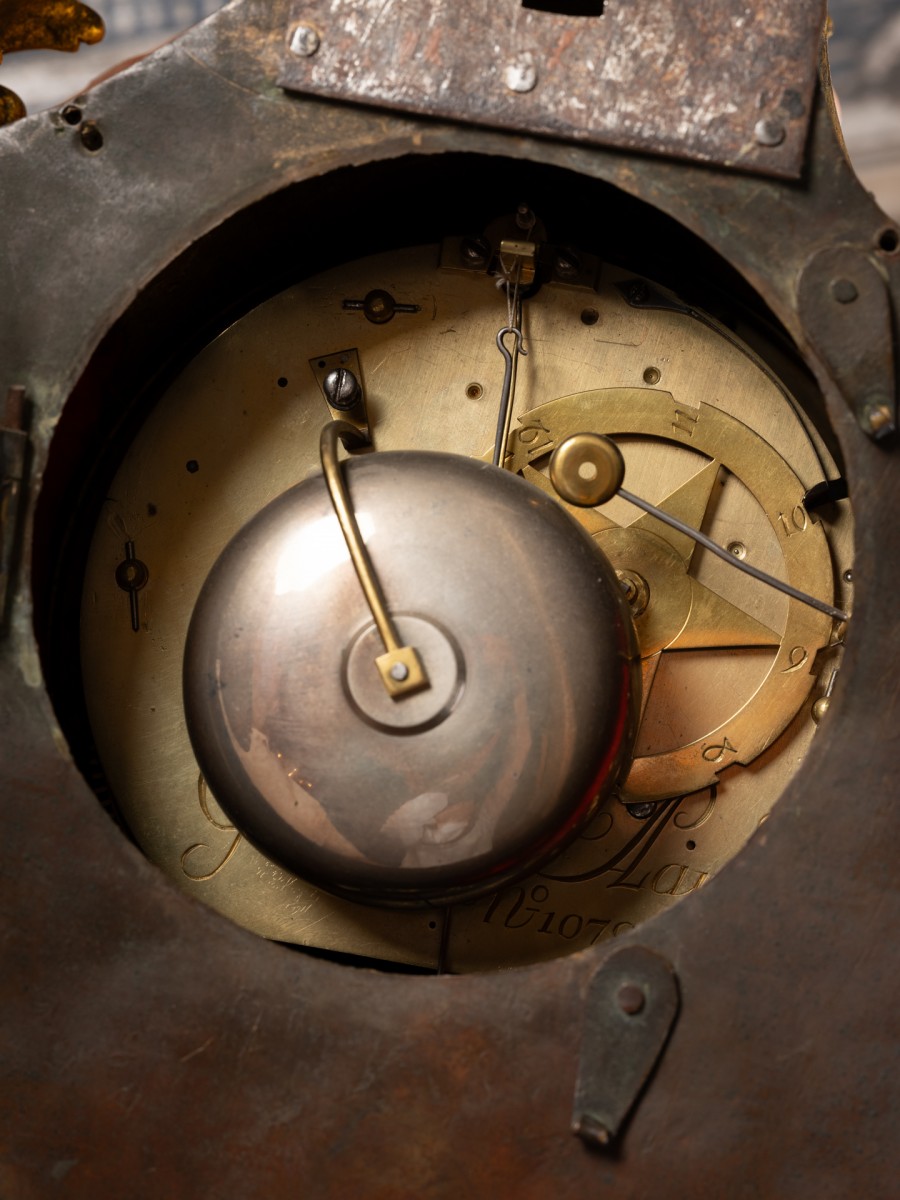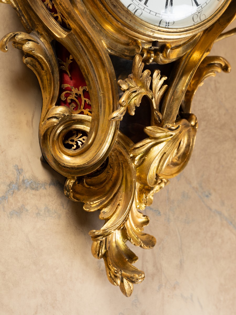 Cartel d’applique en bronze doré d’époque louis XV signé Gudin sur le cadran, la platine également signé Gudin à Paris n° 1072, la suspension à fil.