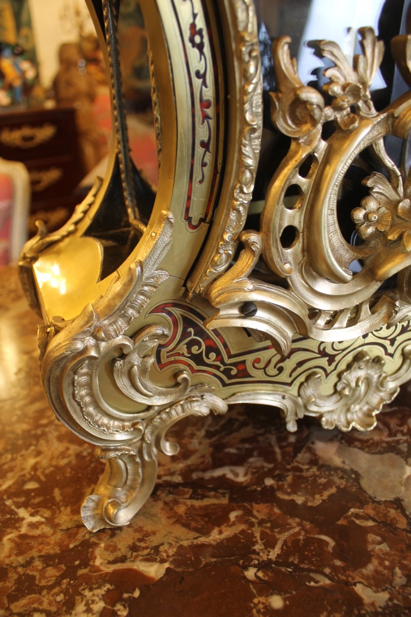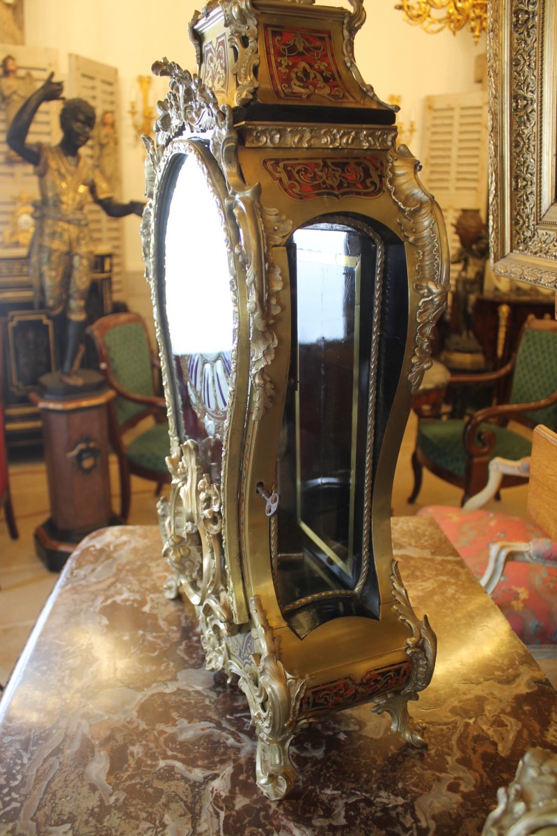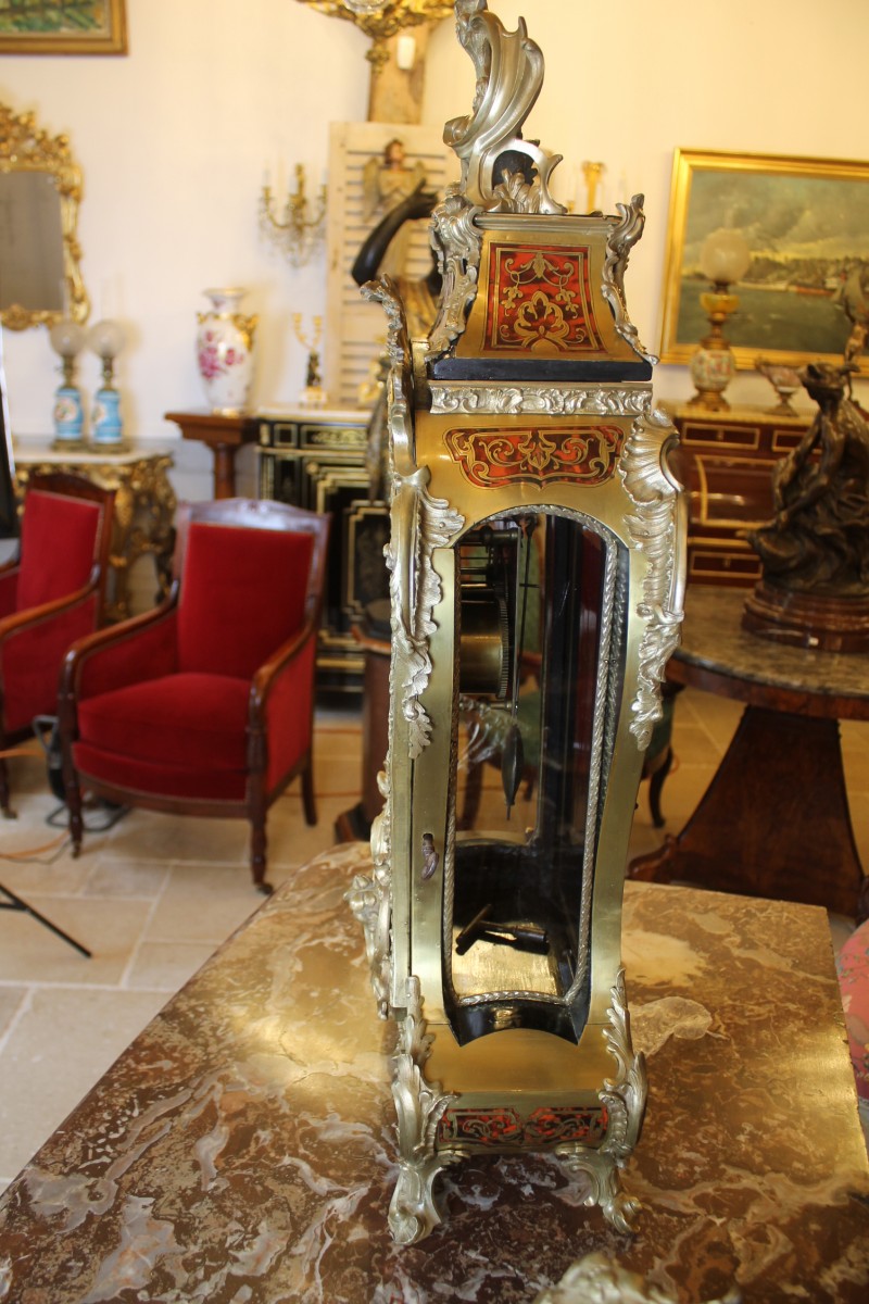 Important cartel et sa console d'applique en marqueterie Boulle de laiton gravé sur fond d'écaille rouge, belle ornementation de bronzes ciselés et dorés à décors de fleurs et feuillages ajourés et asymétriques.