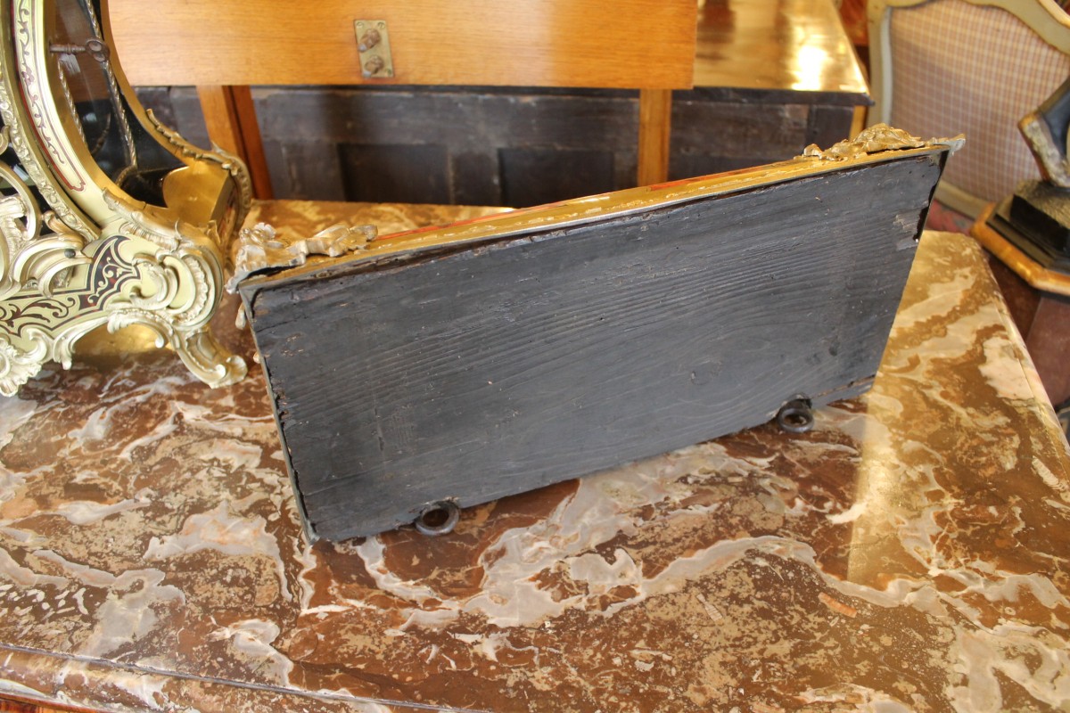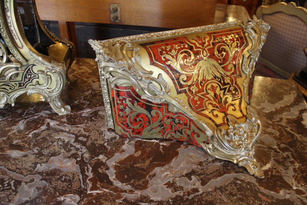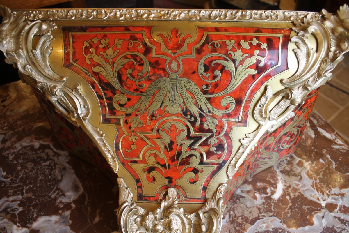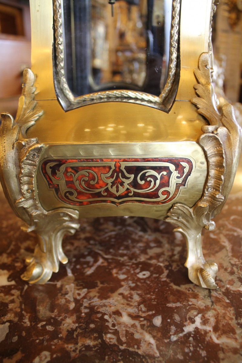 Important cartel et sa console d'applique en marqueterie Boulle de laiton gravé sur fond d'écaille rouge, belle ornementation de bronzes ciselés et dorés à décors de fleurs et feuillages ajourés et asymétriques.