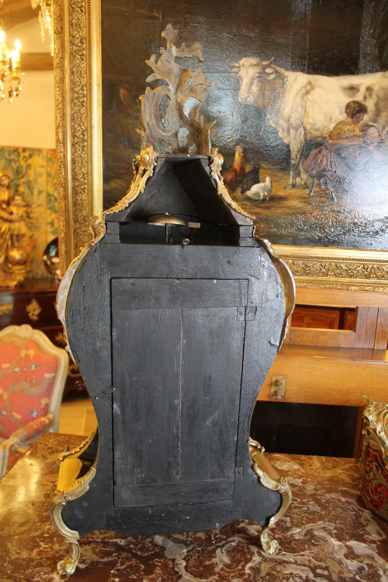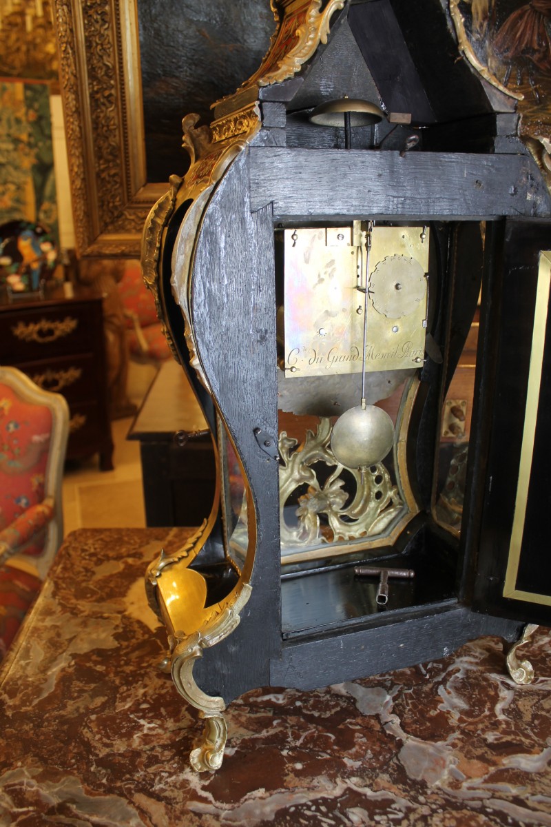 Le cadran en bronze ciselé à cartouches émaillés de chiffres romains, le mouvement signé sur la platine de Claude Du Grand Mesnil à Paris, l'échappement à fil modifié, époque Louis XV.