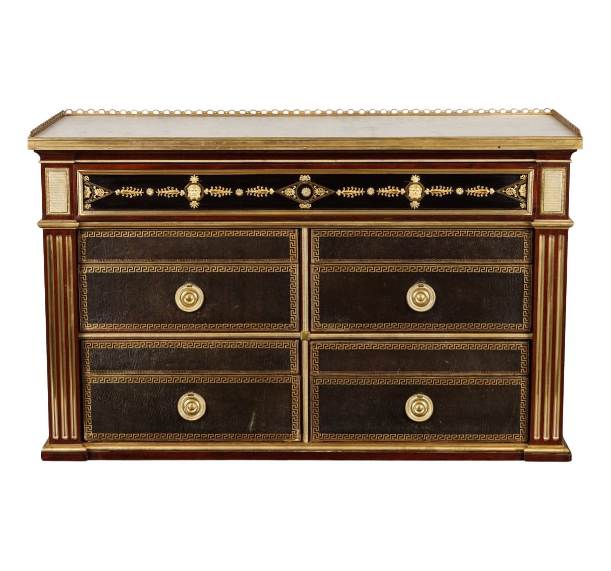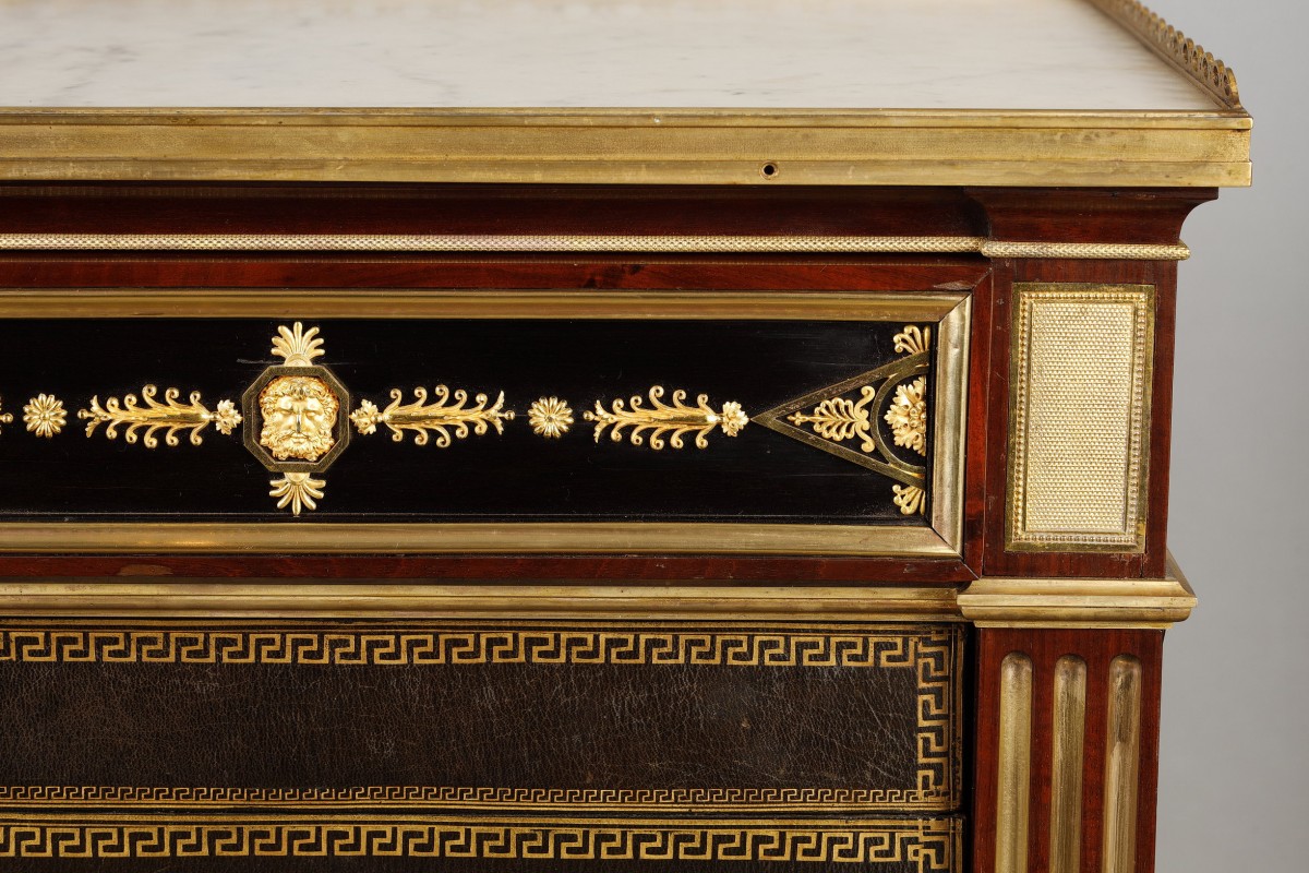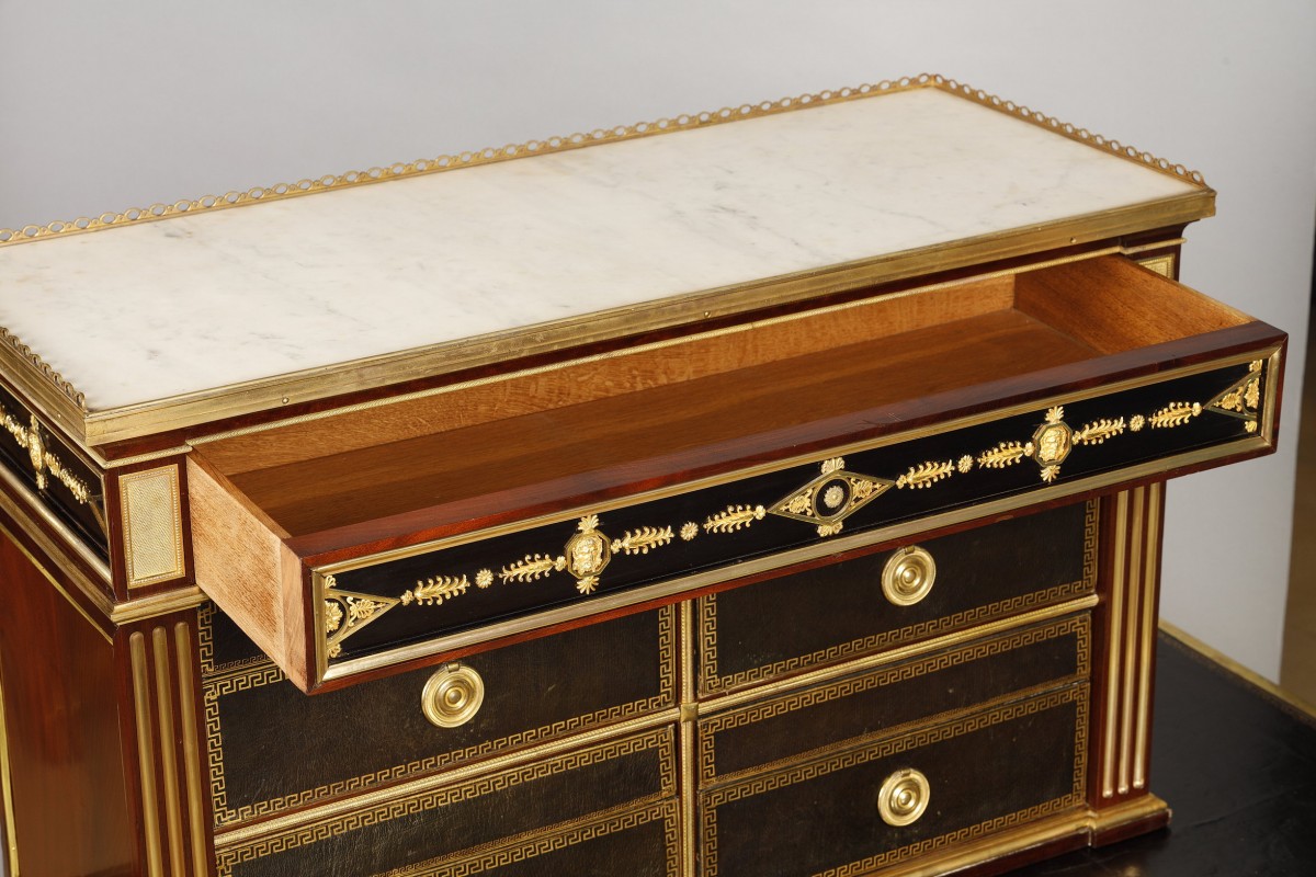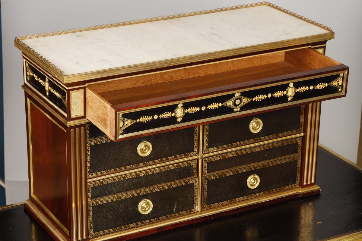 Les tiroirs sont gainés de cuir brun foncé, finement rehaussés de filets et frises dorés, et ornés de boutons de tirage circulaires en bronze doré. Un tiroir dissimulé est aménagé dans la bande supérieure. Ouverture par pression
