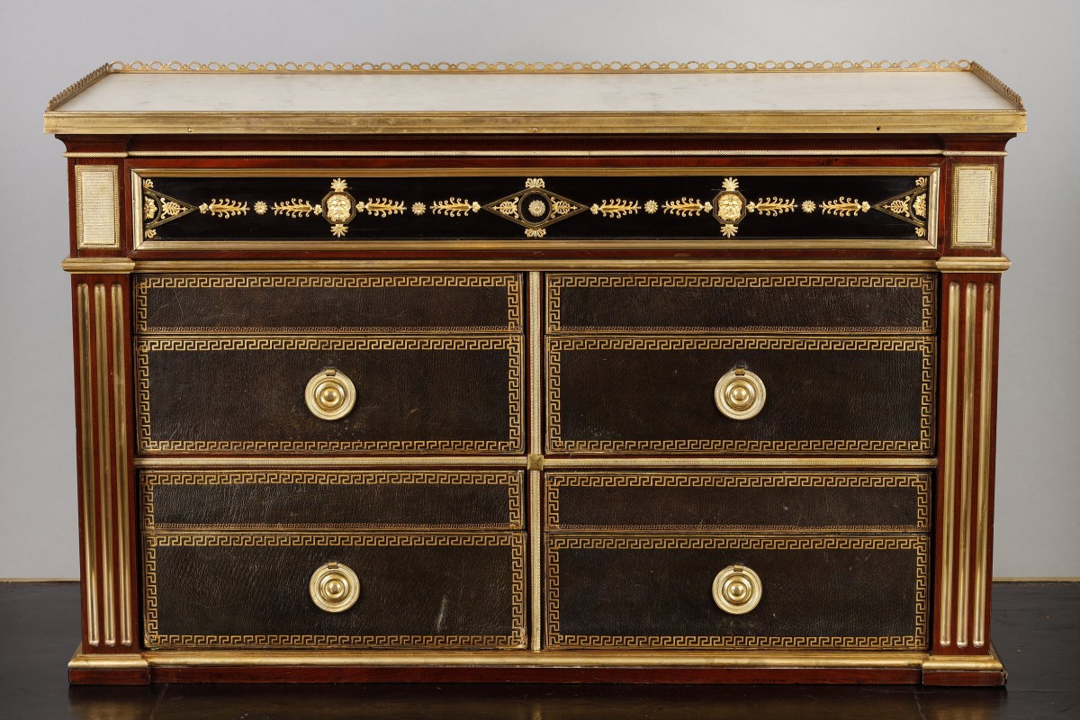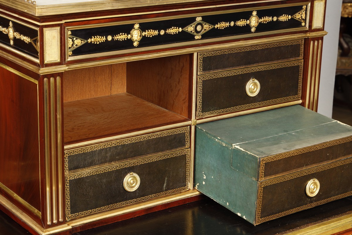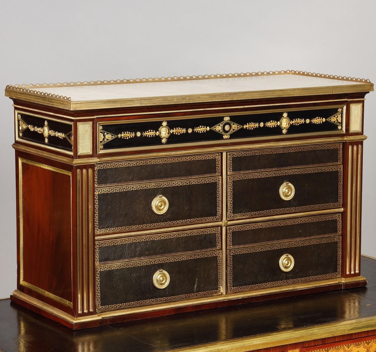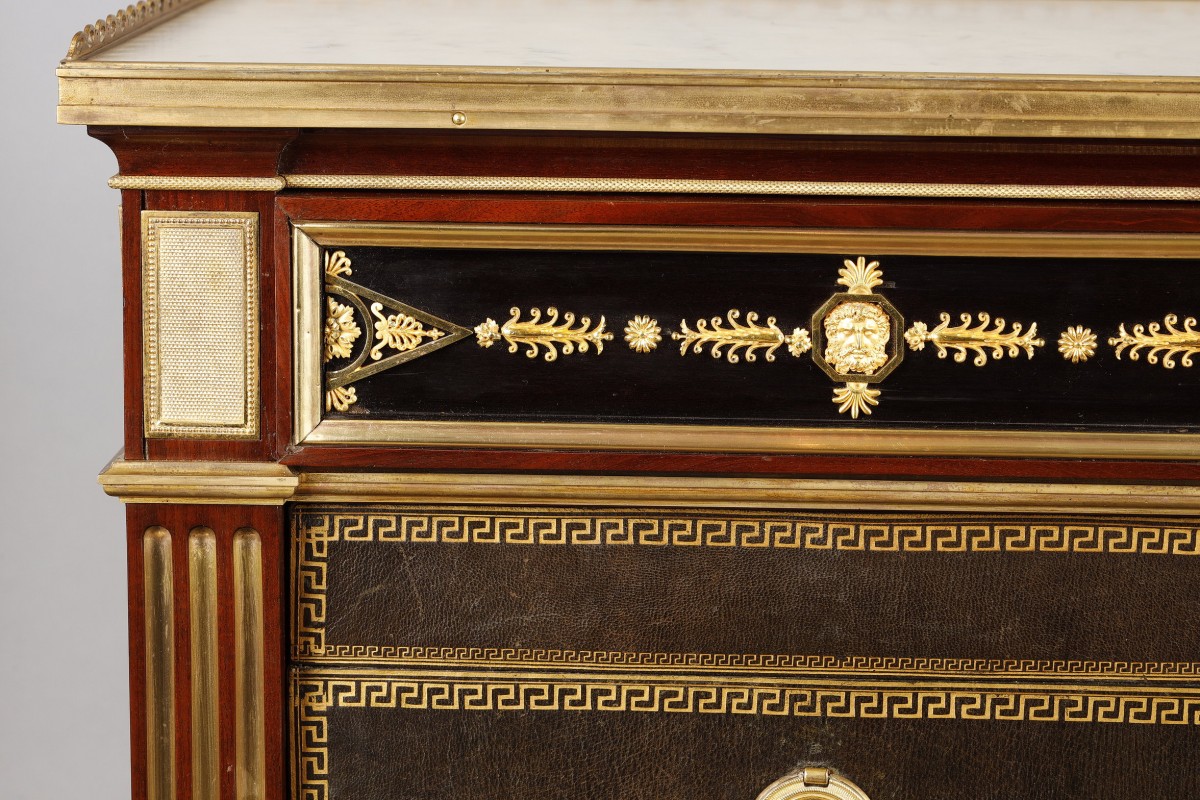 Les tiroirs sont gainés de cuir brun foncé, finement rehaussés de filets et frises dorés, et ornés de boutons de tirage circulaires en bronze doré. Un tiroir dissimulé est aménagé dans la bande supérieure. Ouverture par pression