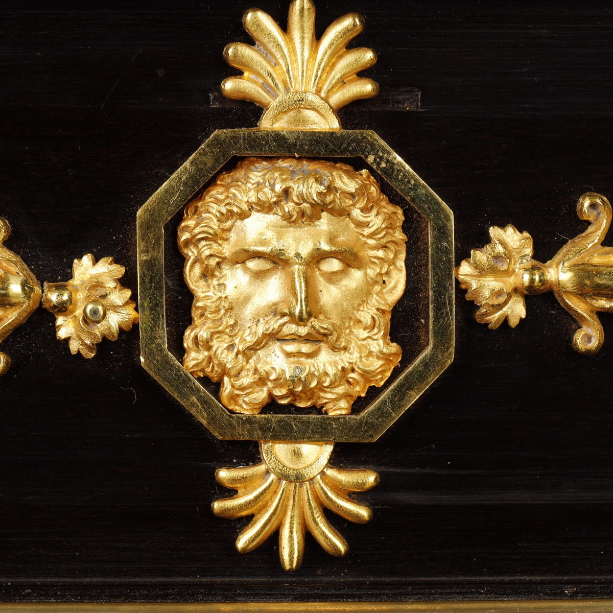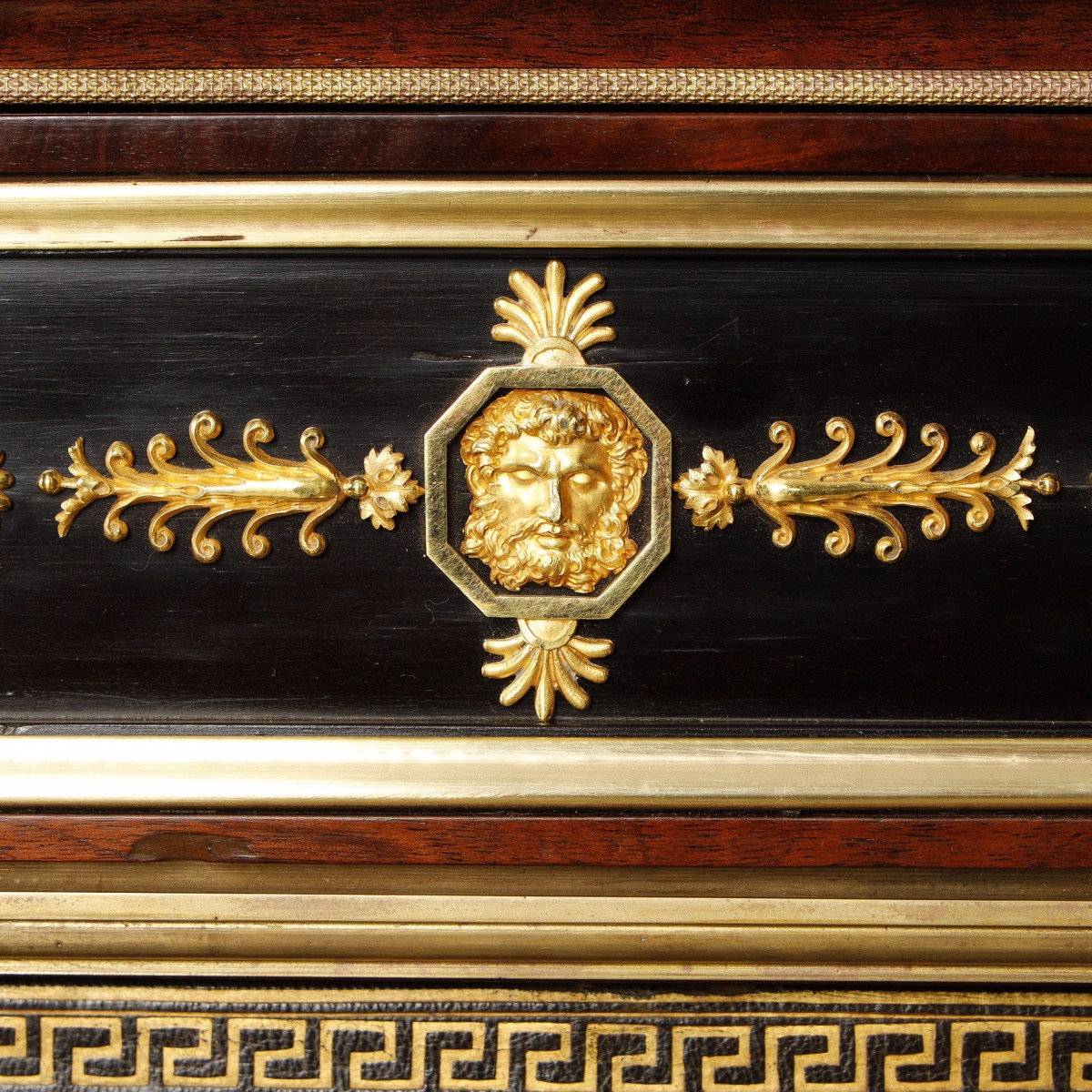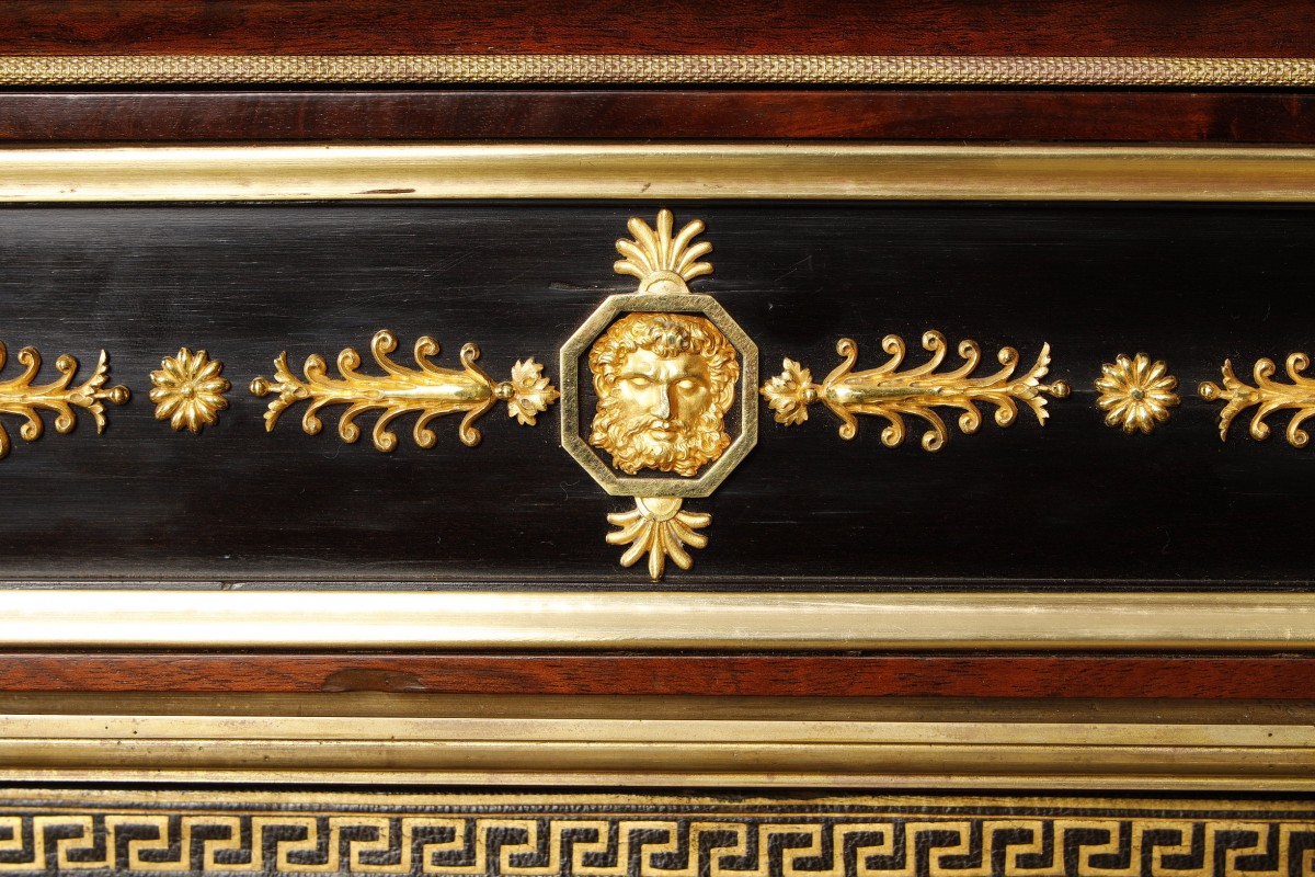 La façade et les côtés sont soulignés de montures en bronze doré, finement ciselées, Montants cannelés en colonne carré. La ceinture du haut est finement orné d'une frise en bronze doré en et tête de satyre