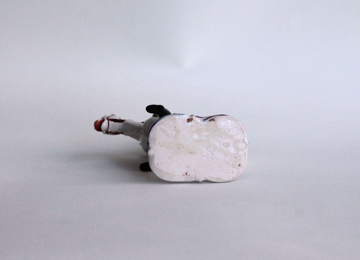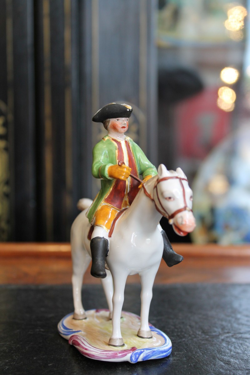 Statuette en faïence représentant un cavalier à décor polychrome et or au naturel, la base contournée, est soulignée de rinceaux en pourpre et en bleu. Lunéville ou Saint-Clément, XVIIIe siècle.