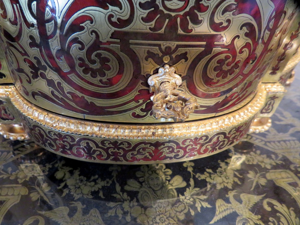 Magnifique marqueterie de laiton sur une écaille rouge.