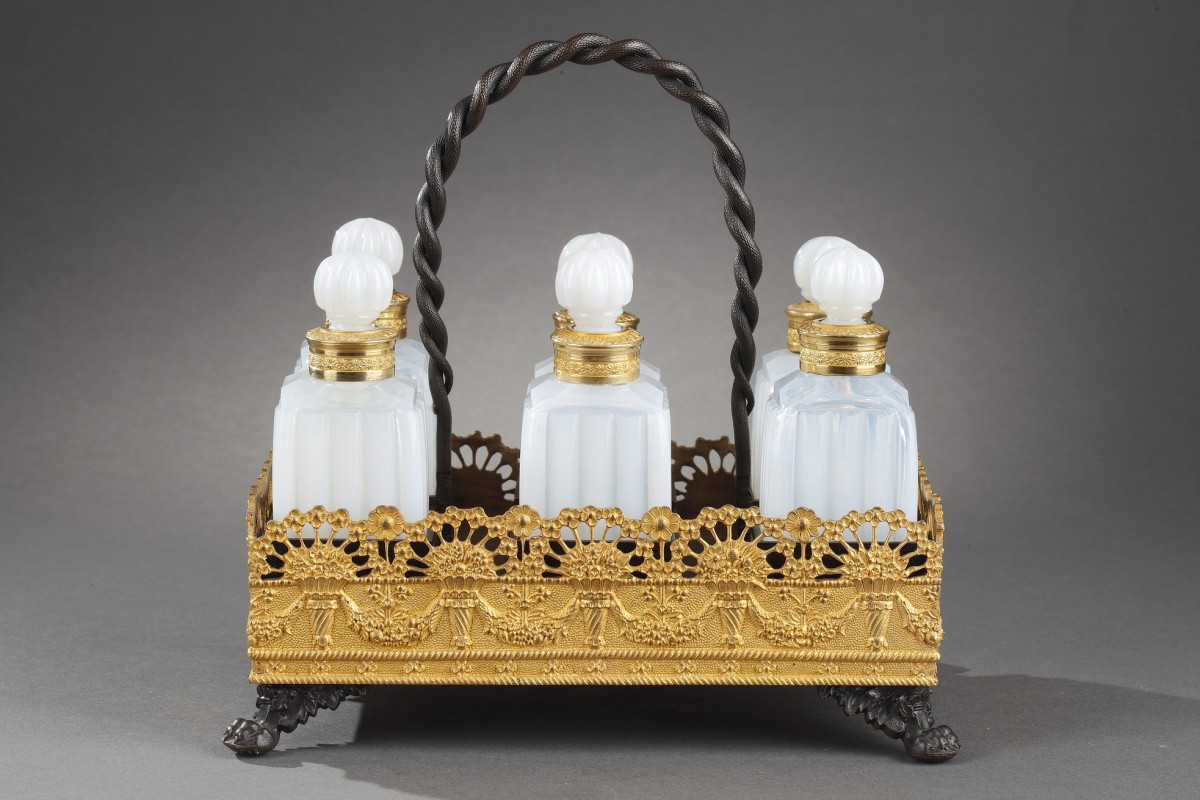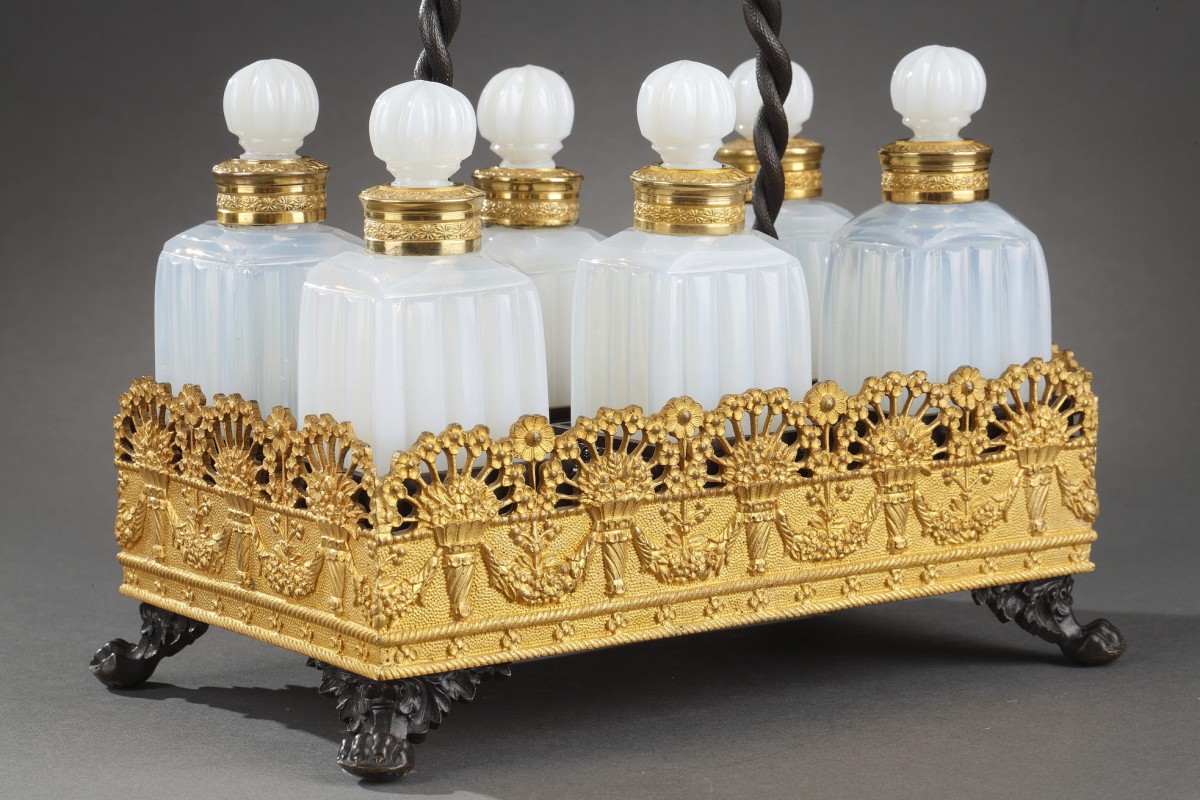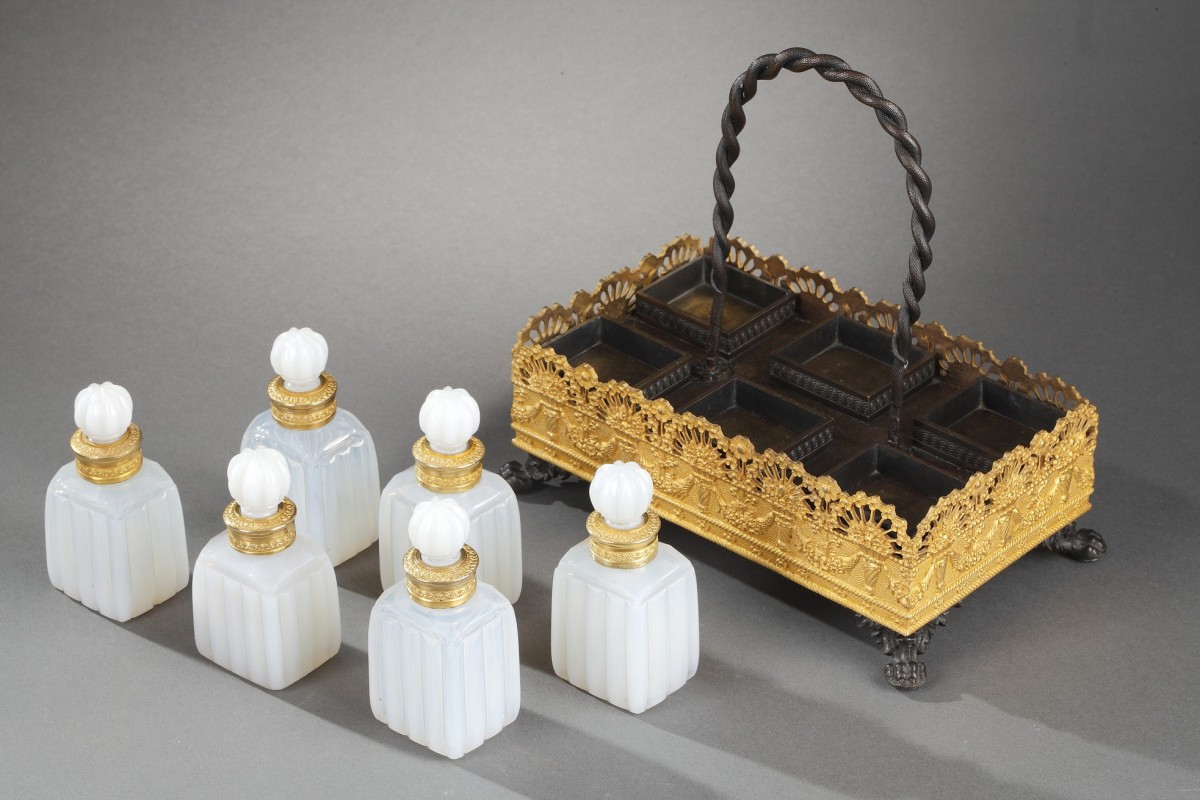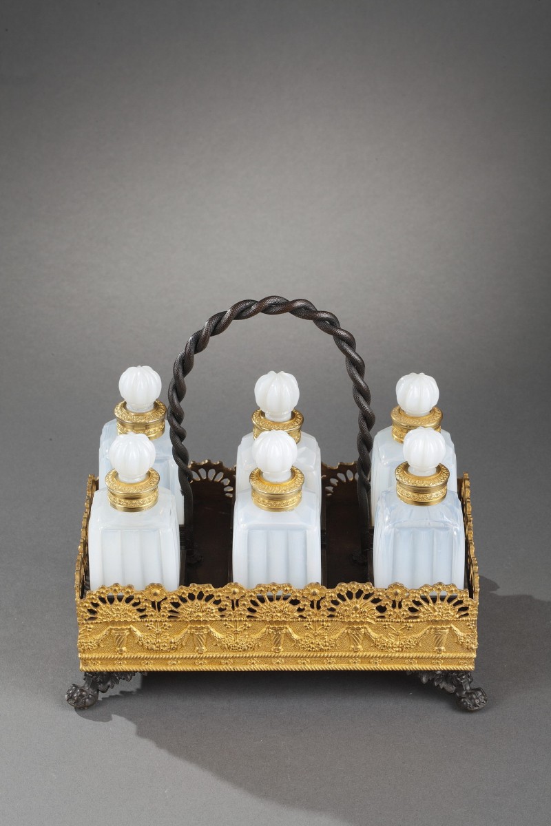 Cave à parfum en opaline laiteuse soufflé et taillé, monture en bronze doré et patiné comprenant six flacons avec leurs bouchons amovibles. Tous les flacons sont taillés avec une taille dite « en bambou » et leurs cols sont sertis d'une bague en bronze doré. Le plateau de cette cave à odeurs est décoré d'une frise de bouquets fleuris desquels sortent des hortensias ainsi que de guirlandes florales. Sur ce plateau, six compartiments carrés reçoivent les flacons permettant ainsi plus de stabilité lors d'un transport. Le plateau repose sur quatre pattes de lion et comporte une anse torsadée en bronze patiné.