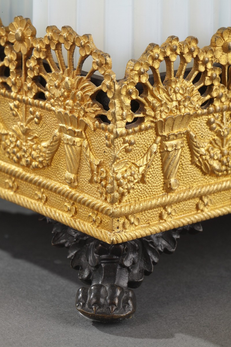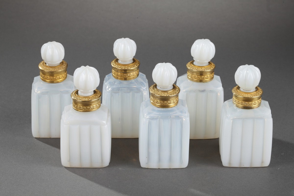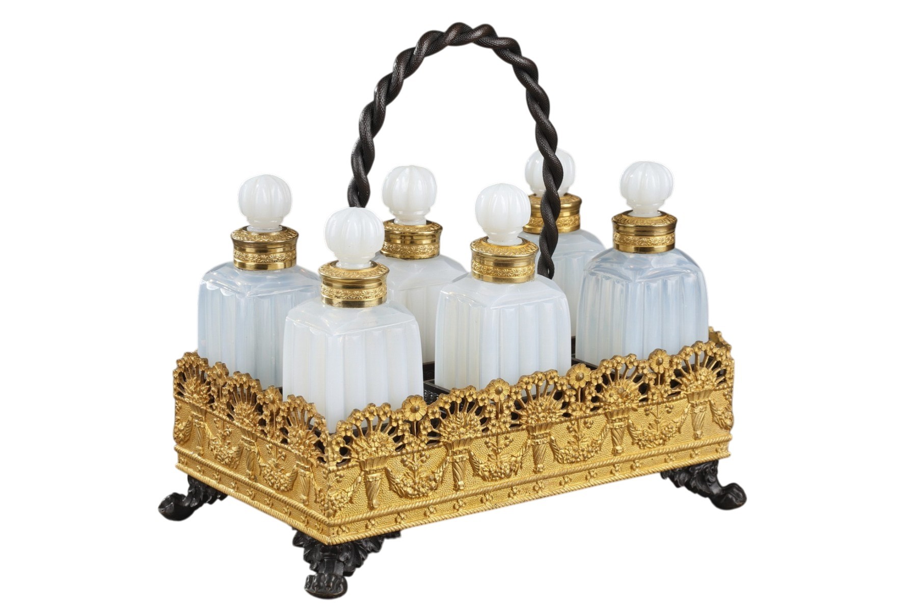 Cave à parfum en opaline laiteuse soufflé et taillé, monture en bronze doré et patiné comprenant six flacons avec leurs bouchons amovibles. Tous les flacons sont taillés avec une taille dite « en bambou » et leurs cols sont sertis d'une bague en bronze doré. Le plateau de cette cave à odeurs est décoré d'une frise de bouquets fleuris desquels sortent des hortensias ainsi que de guirlandes florales. Sur ce plateau, six compartiments carrés reçoivent les flacons permettant ainsi plus de stabilité lors d'un transport. Le plateau repose sur quatre pattes de lion et comporte une anse torsadée en bronze patiné.