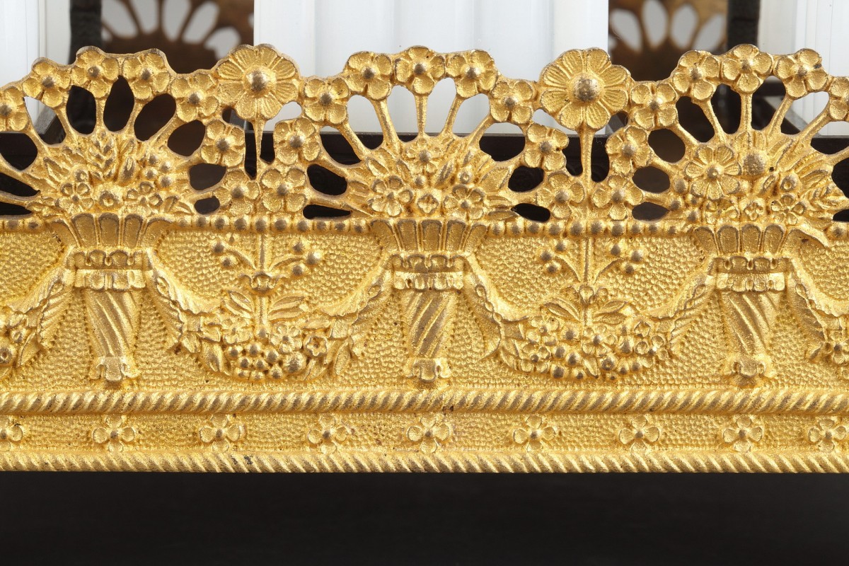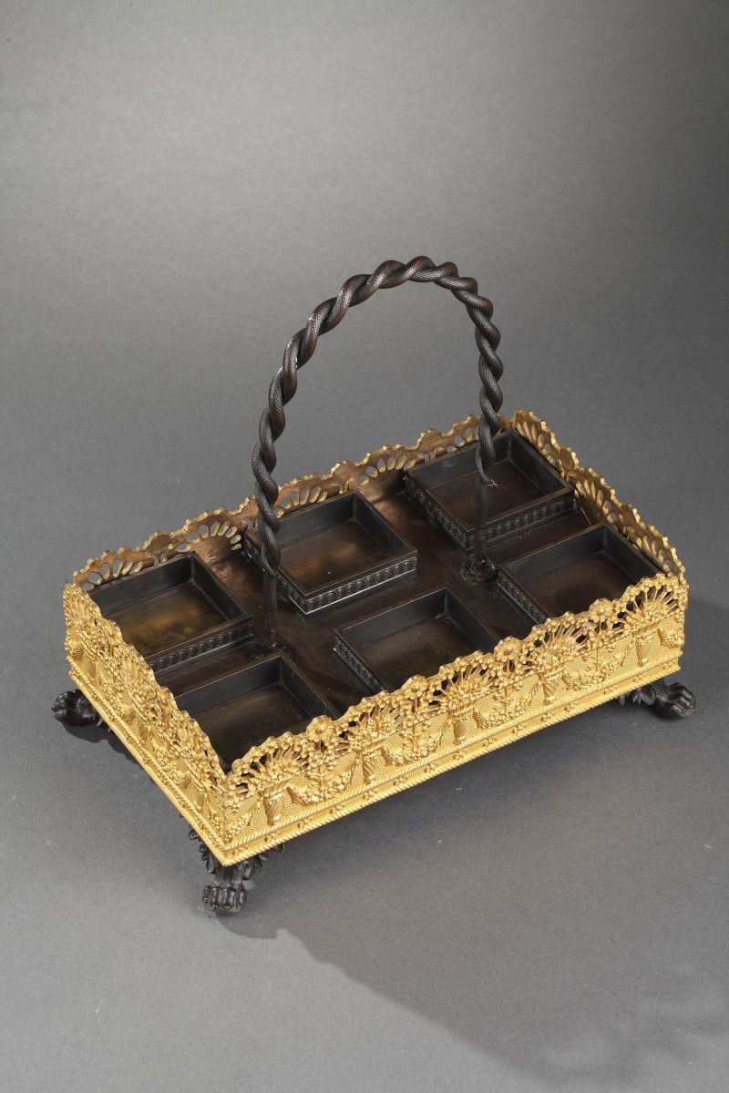 Le jeu des mats et des brunis du bronze et la grande qualité du travail du cristal sont caractéristiques de la production d'objets de toilette apparue dans la première partie du XIXème siècle sous la Restauration.