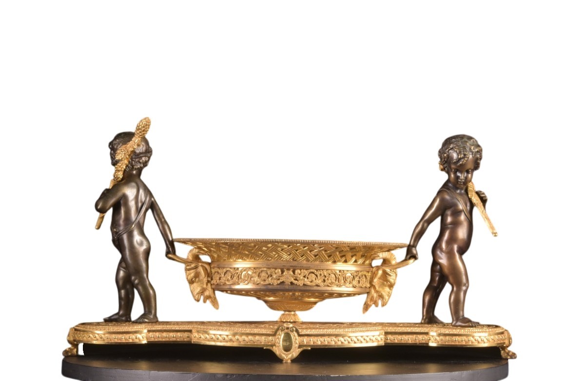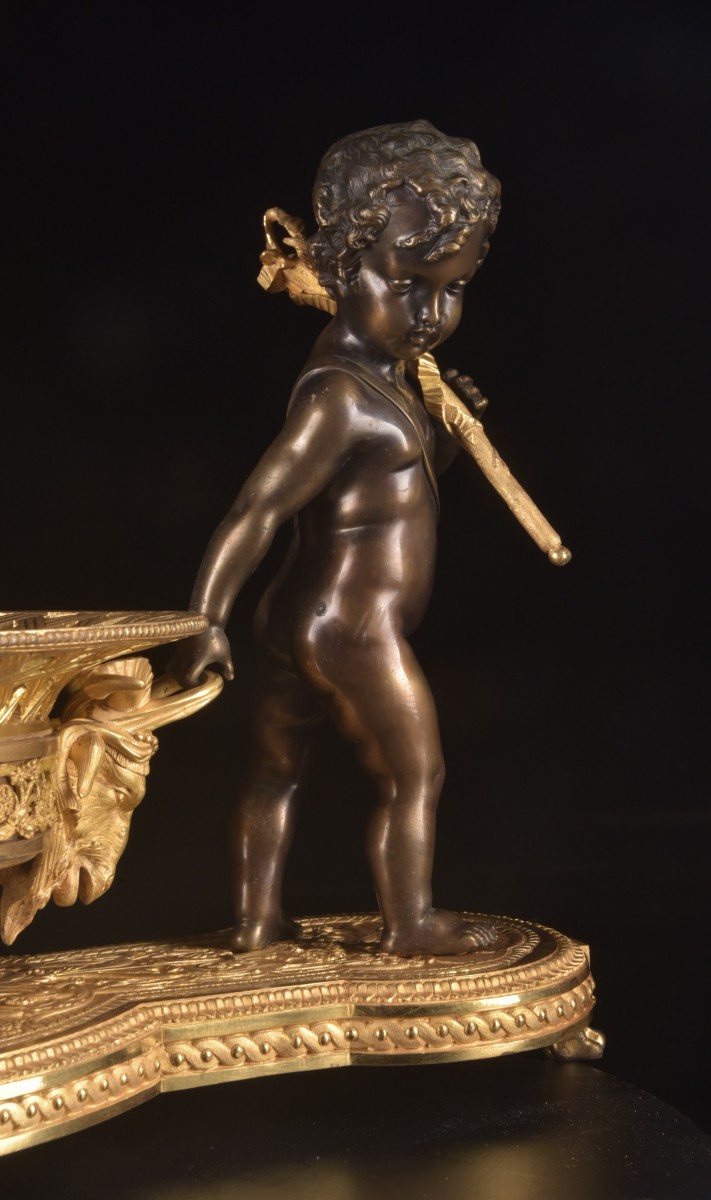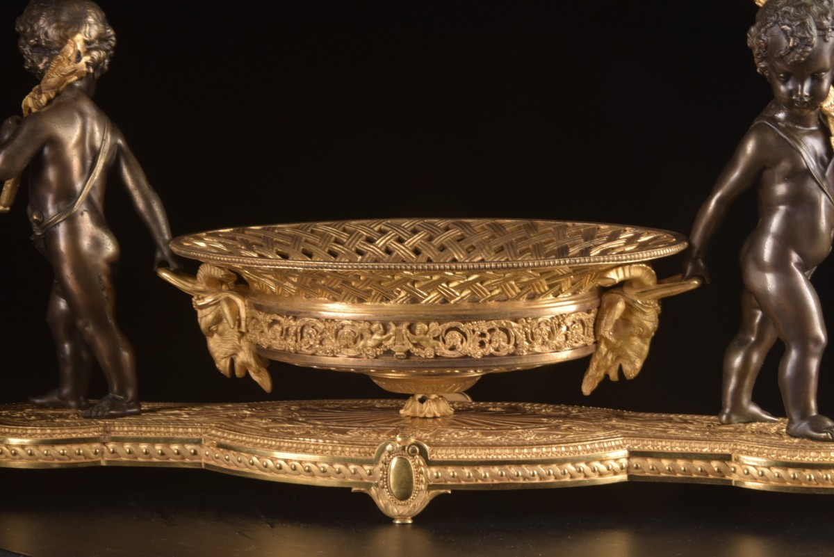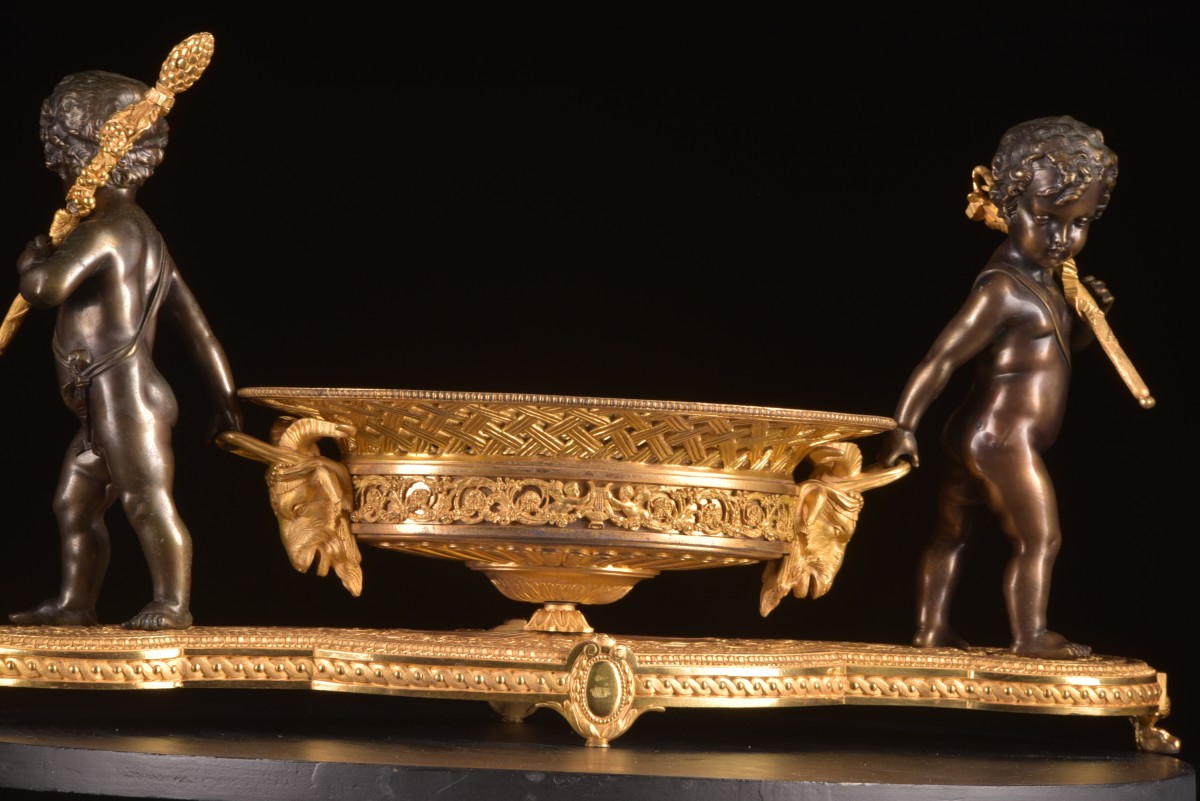 Élégant centre de table de la période Charles X (vers 1820–1830), réalisé en bronze doré et bronze patiné. La composition est soutenue par deux putti finement sculptés reposant sur une base richement décorée. Les figures portent chacune une hampe sur l’épaule tout en tenant la coupe centrale, créant une composition sculpturale vivante et équilibrée.