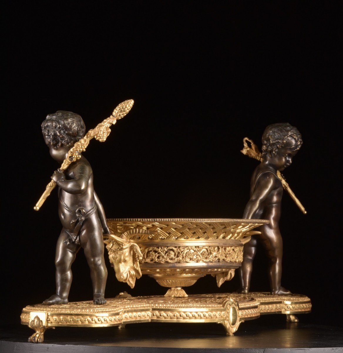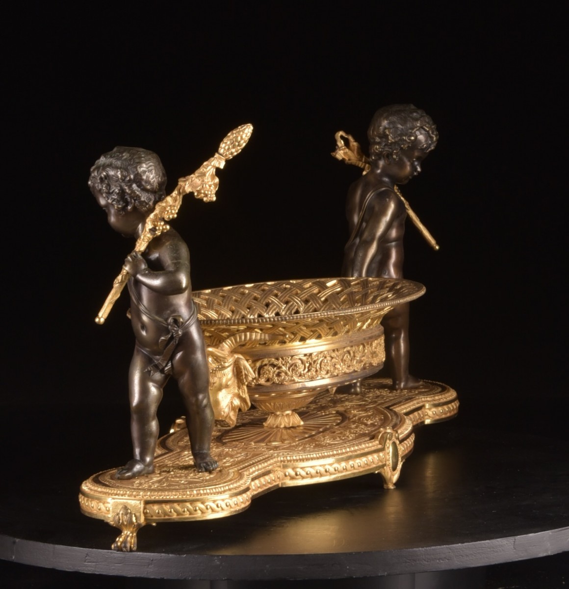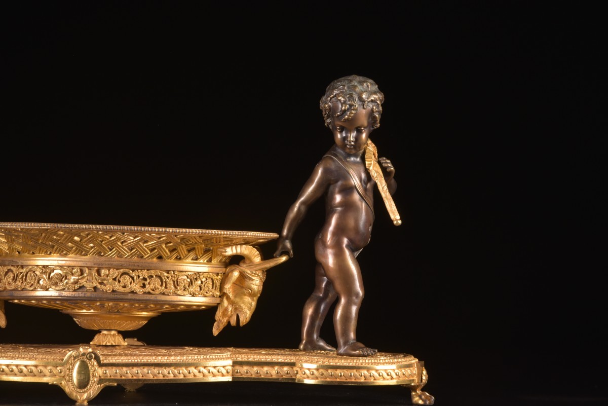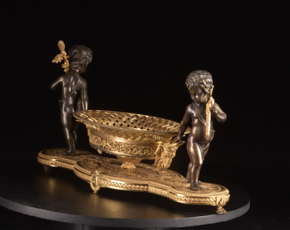 Élégant centre de table de la période Charles X (vers 1820–1830), réalisé en bronze doré et bronze patiné. La composition est soutenue par deux putti finement sculptés reposant sur une base richement décorée. Les figures portent chacune une hampe sur l’épaule tout en tenant la coupe centrale, créant une composition sculpturale vivante et équilibrée.