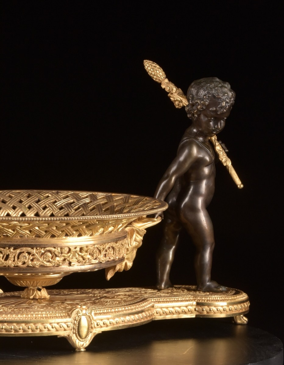 La coupe centrale est réalisée en bronze doré ajouré avec un décor élégant de treillage. La partie inférieure est ornée de mascarons et repose sur un petit piédouche central. La base allongée est décorée de motifs classiques, notamment de frises perlées et de petits pieds décoratifs.