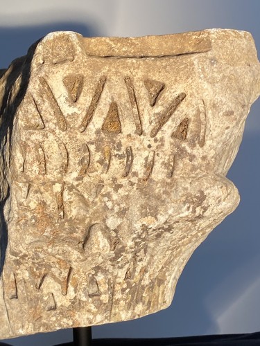 Chapiteau de coin roman avec decoration géométrique. Sudouest de la France, 12e siècle. Bon état. Soclé. Dimensions: 30x30x30cm. Poids: apport. 50 kg.