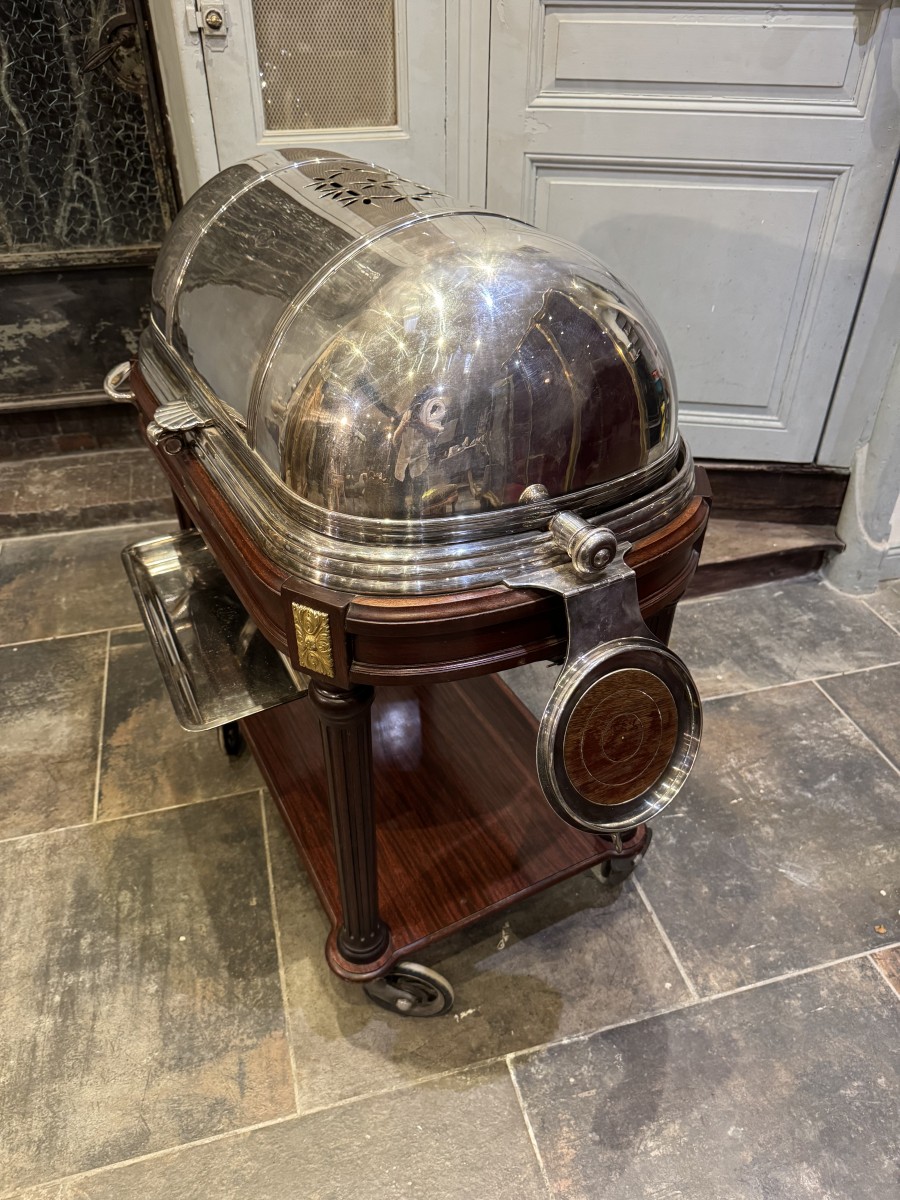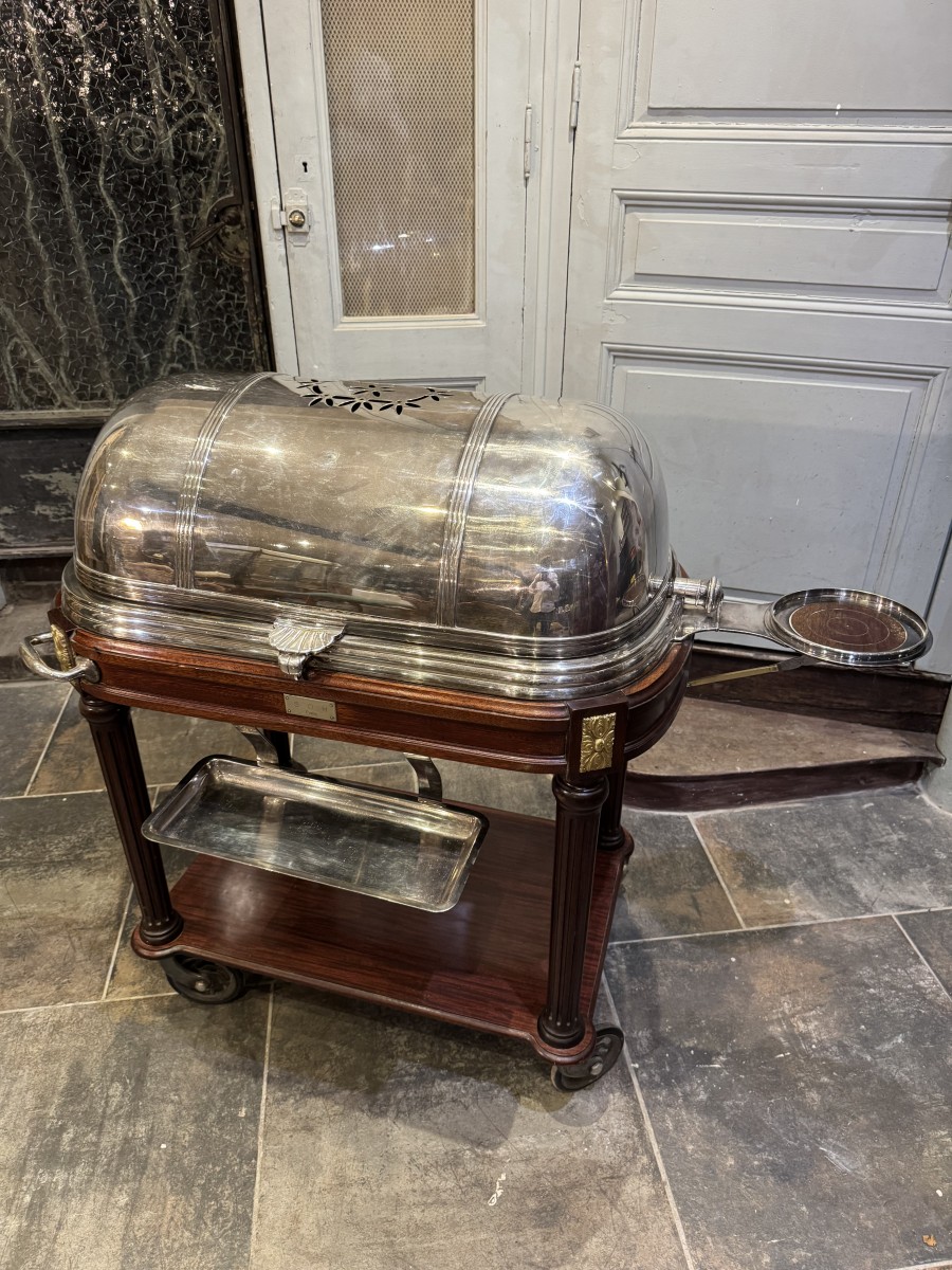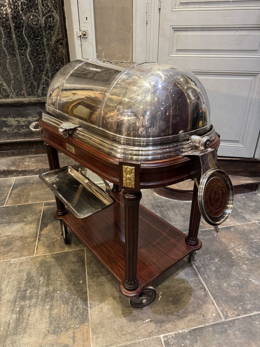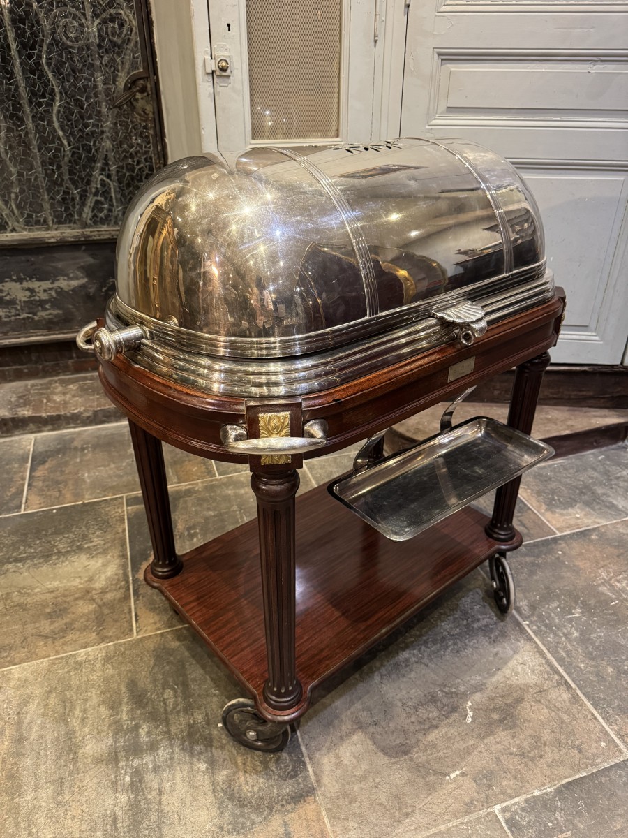 Chariot à decouper de restaurant en métal argenté et acajou.