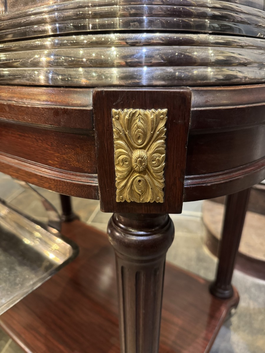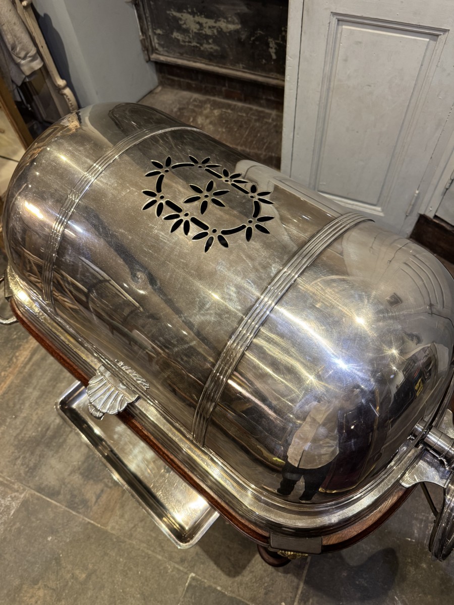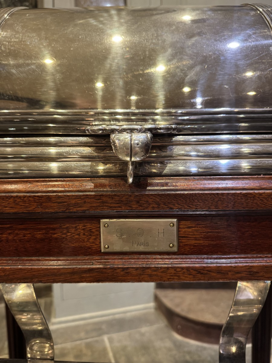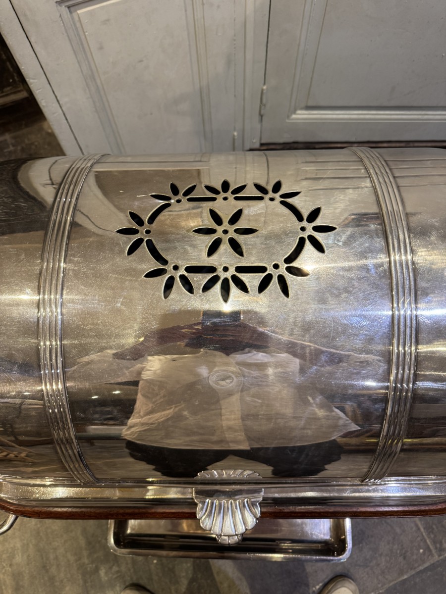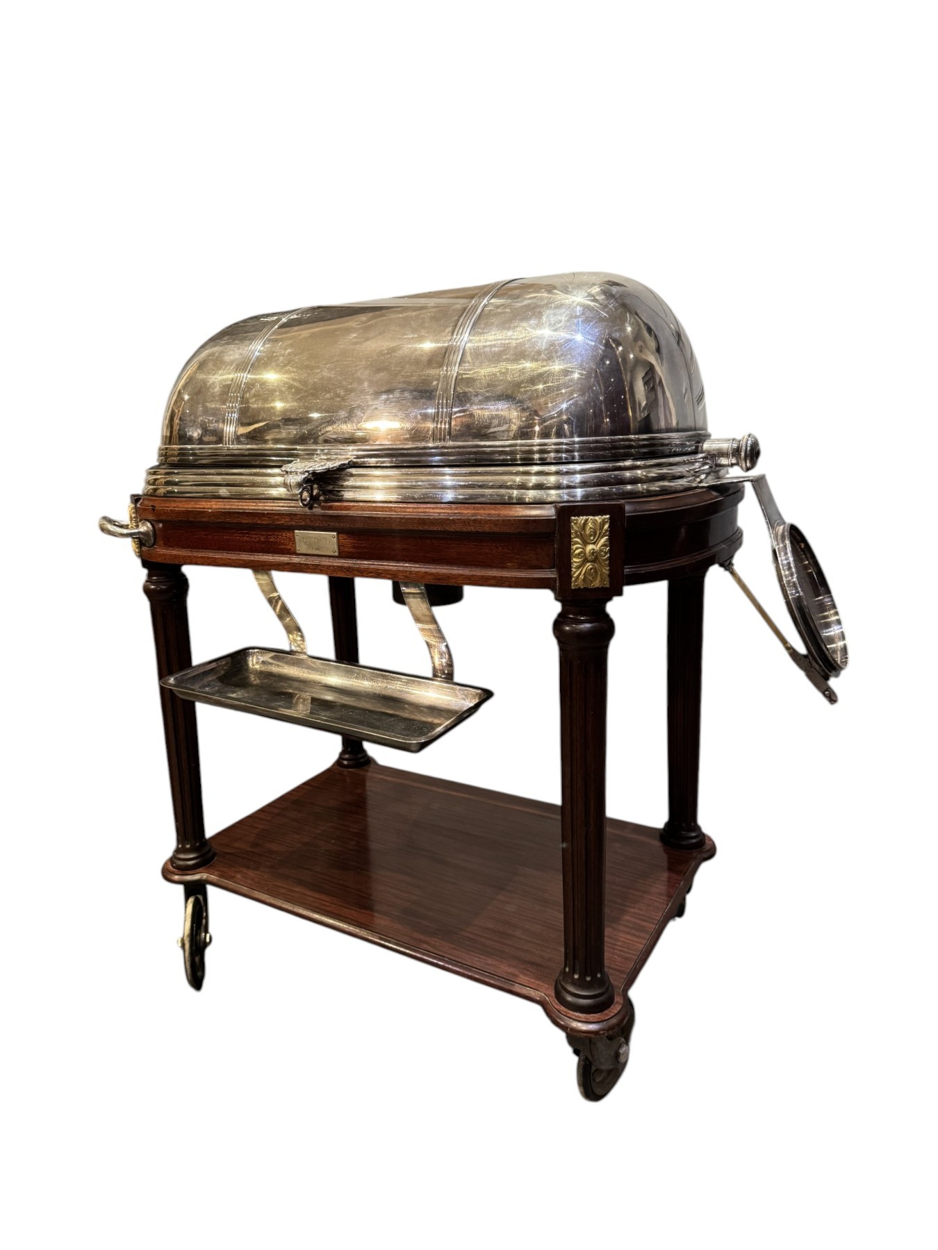 Chariot à decouper de restaurant en métal argenté et acajou.