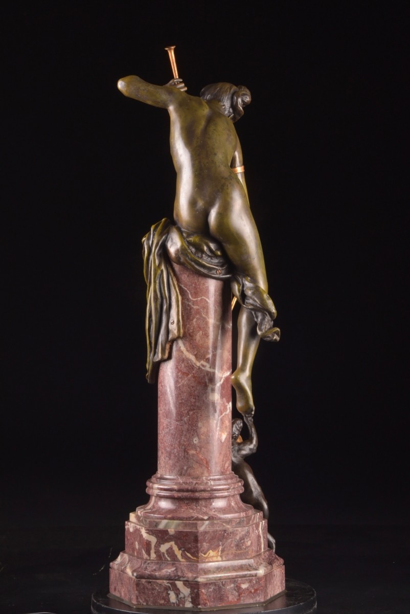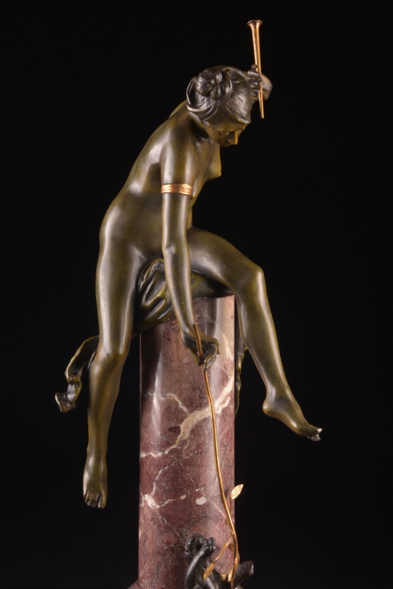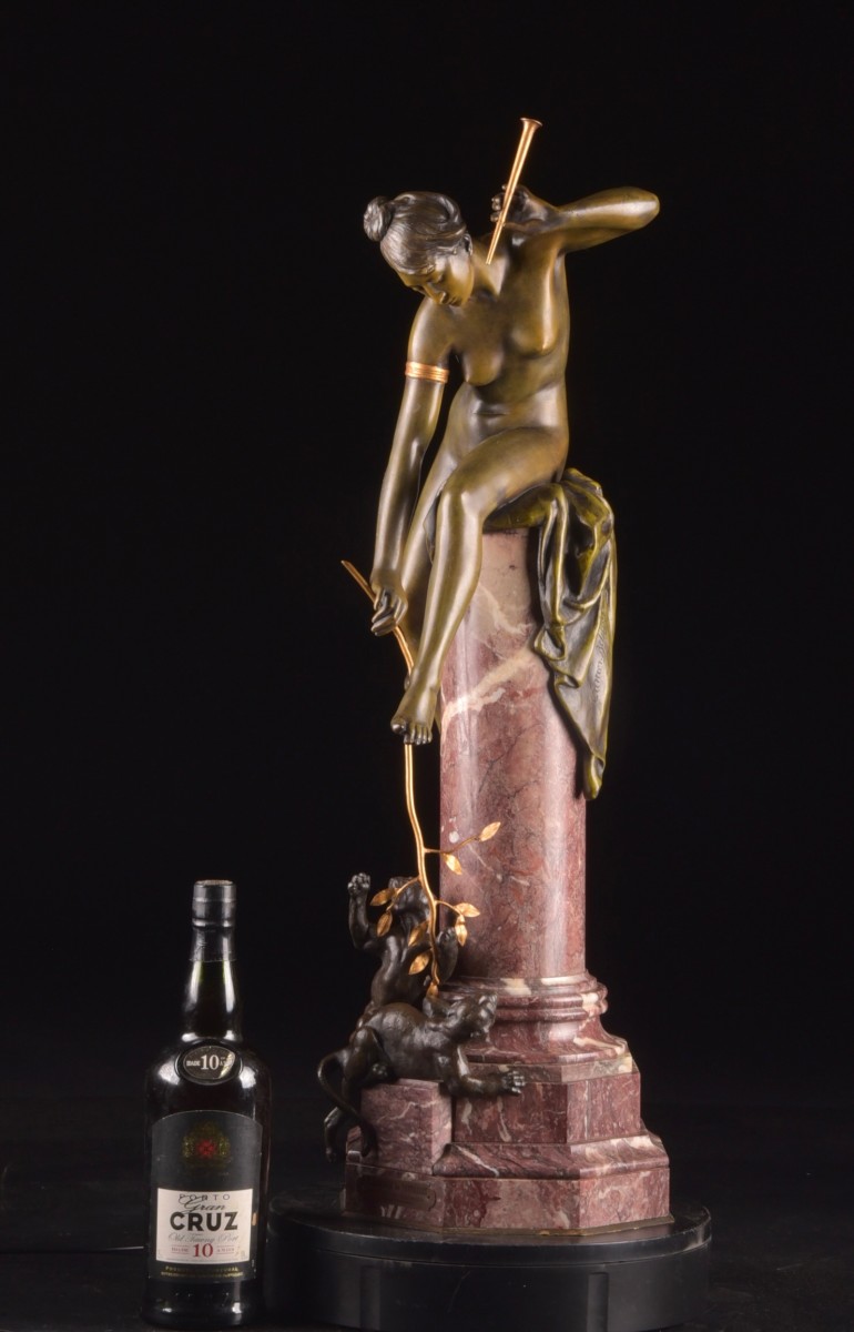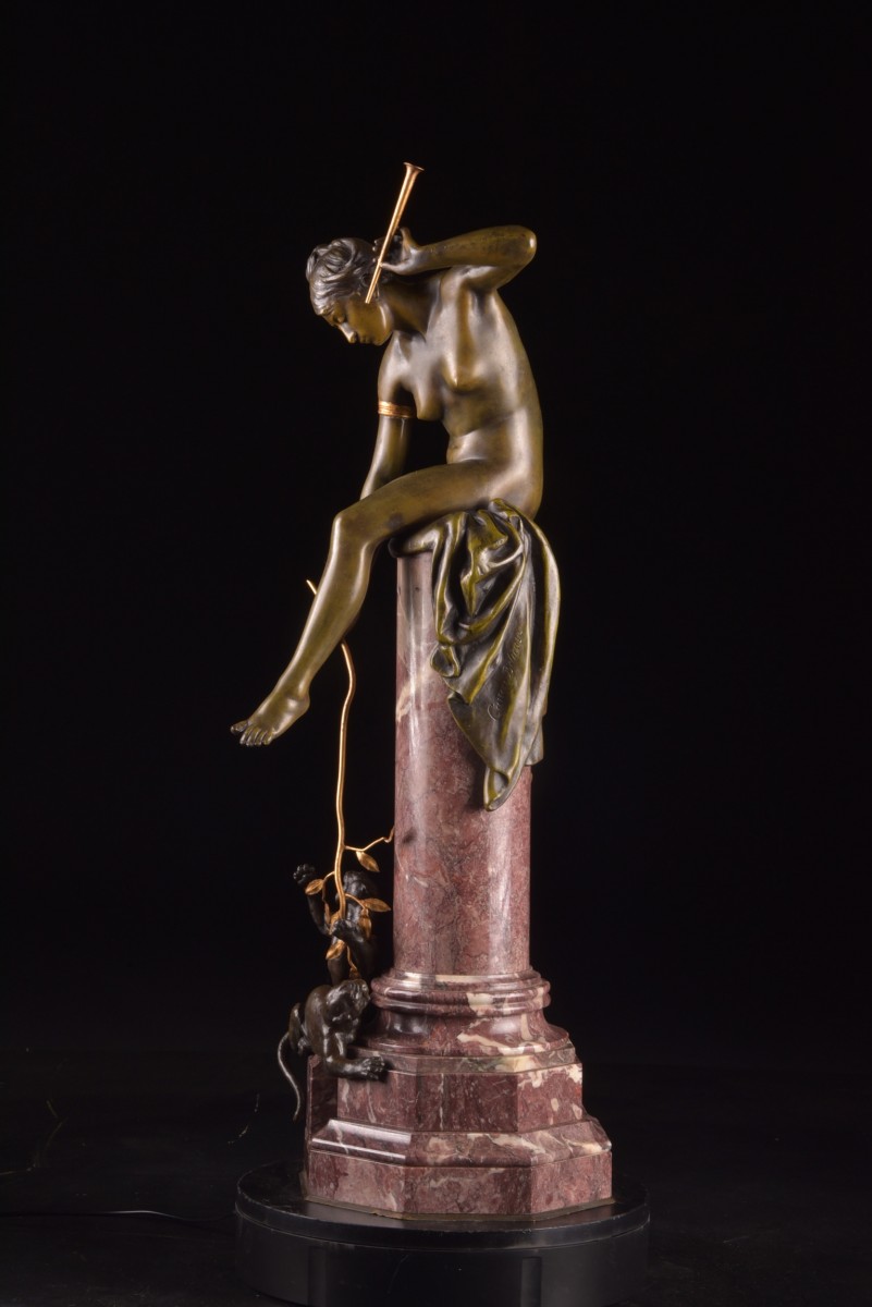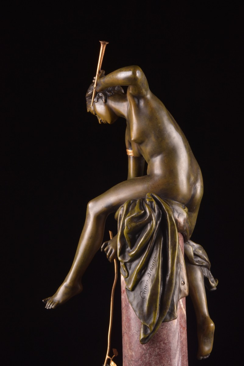 France, seconde moitié du XIXe siècle Ce raffiné ensemble sculptural, Charmeuse de Panthères, est l’œuvre d’Albert-Ernest Carrier-Belleuse, l’un des sculpteurs français les plus influents du XIXe siècle. La composition représente une figure féminine élégante, assise sur une colonne en marbre rouge, maîtrisant avec douceur et assurance deux panthères à l’aide d’un fin rameau doré. Le subtil équilibre entre grâce et retenue est caractéristique de l’œuvre de Carrier-Belleuse et reflète pleinement l’esthétique raffinée du Second Empire. La sculpture est réalisée en bronze à patine sombre, rehaussée de délicats accents dorés. Elle repose sur un socle en marbre rouge richement veiné, qui renforce le caractère monumental de l’ensemble et crée une harmonie équilibrée entre la sculpture et sa base. La plaquette d’origine porte le titre Charmeuse de Panthères ainsi que l’inscription par ...