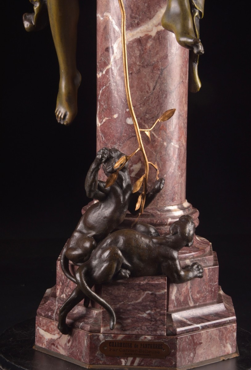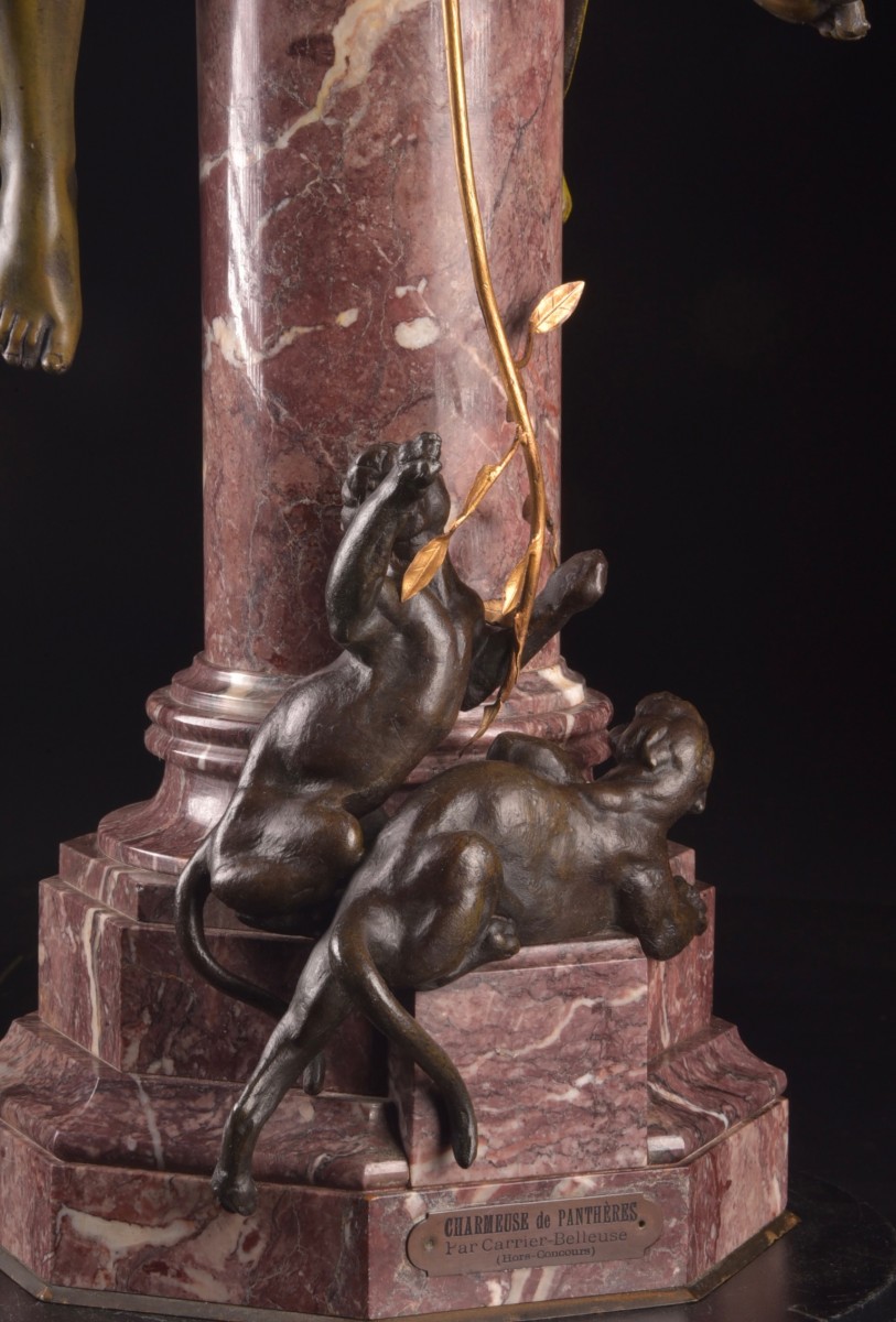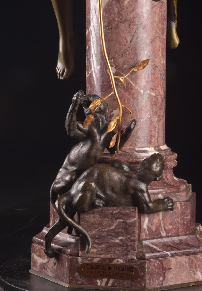 ... Carrier-Belleuse (Hors-Concours), attestant d’une présentation prestigieuse hors compétition et soulignant le statut reconnu de l’artiste. Carrier-Belleuse exposa régulièrement au Salon de Paris et bénéficia d’une renommée internationale pour sa capacité à conjuguer rigueur académique, élégance décorative et raffinement sensuel. Il joua également un rôle majeur en tant que maître et mentor auprès de jeunes artistes, notamment Auguste Rodin, qui travailla dans son atelier durant les années 1860. Œuvre de grande qualité artistique, Charmeuse de Panthères constitue un exemple représentatif de la sculpture française du XIXe siècle, alliant maîtrise technique et sophistication expressive.