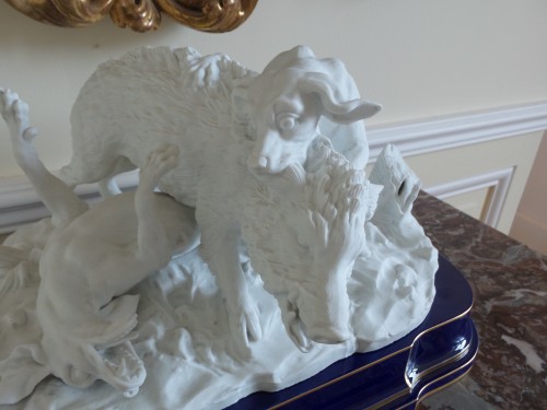 Cette scène de chasse en biscuit de Sèvres reprend un modèle de surtout fabriqué depuis 1776 suivant un projet de Jean-Baptiste Oudry. Cette production de série est encore commercialisée au début du XXe siècle.