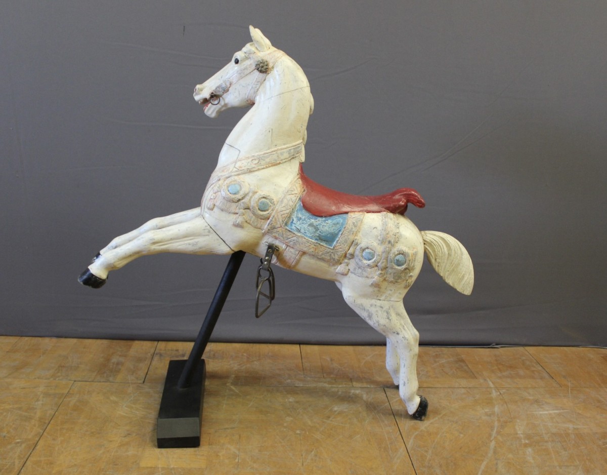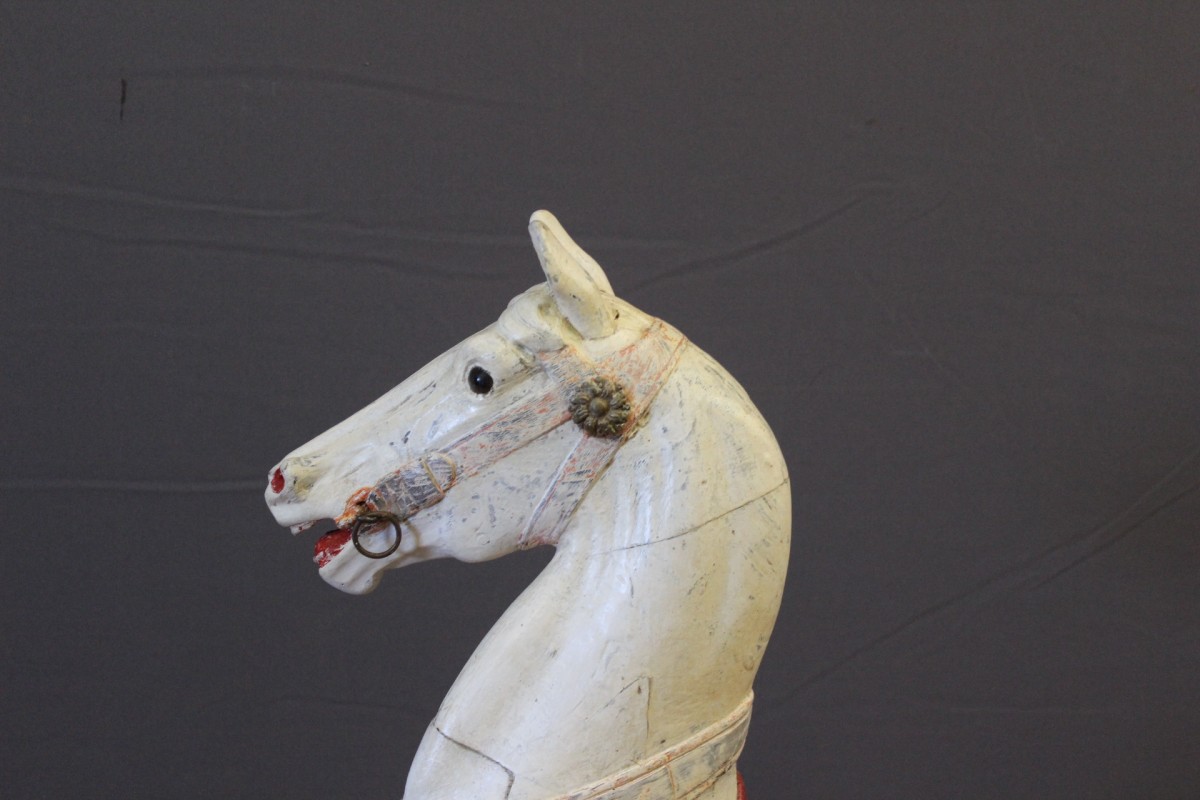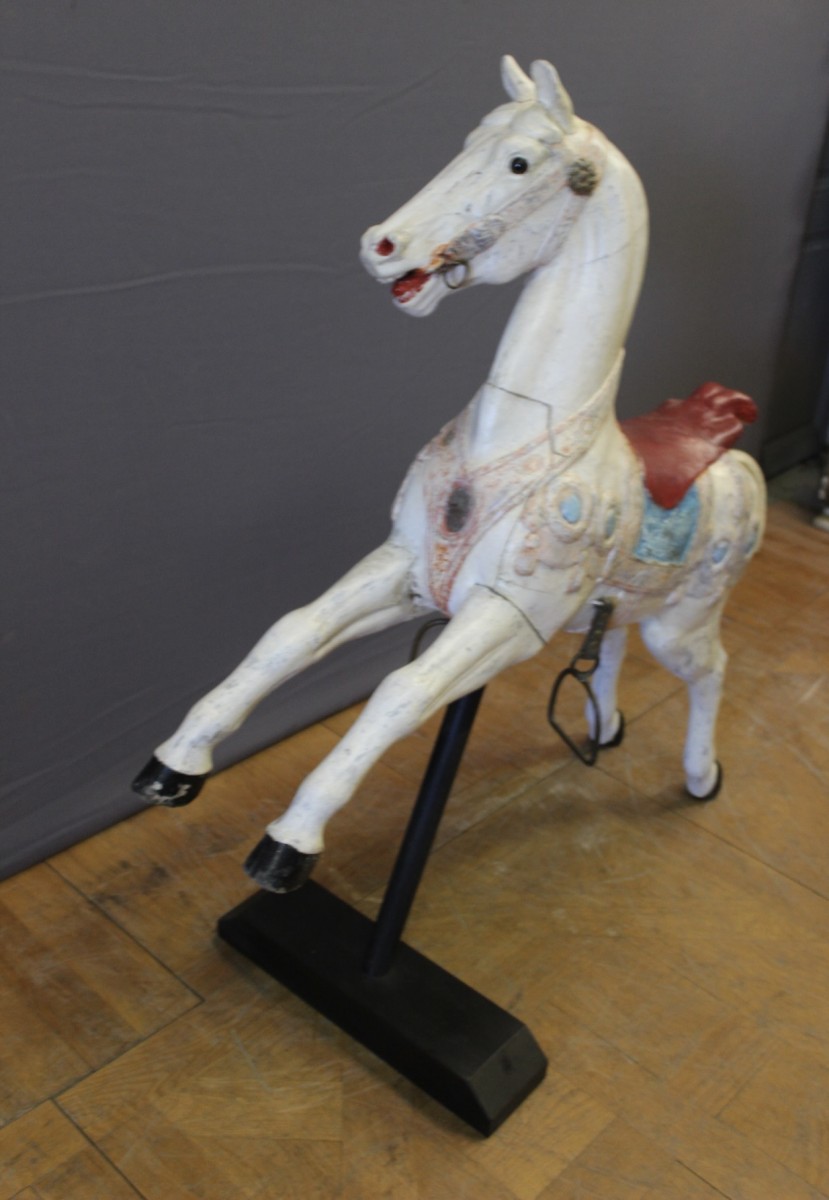 Cheval de manège en bois sculpté polychrome , hauteur sans le socle 83 cm , époque finXIX , ensemble en très bon état