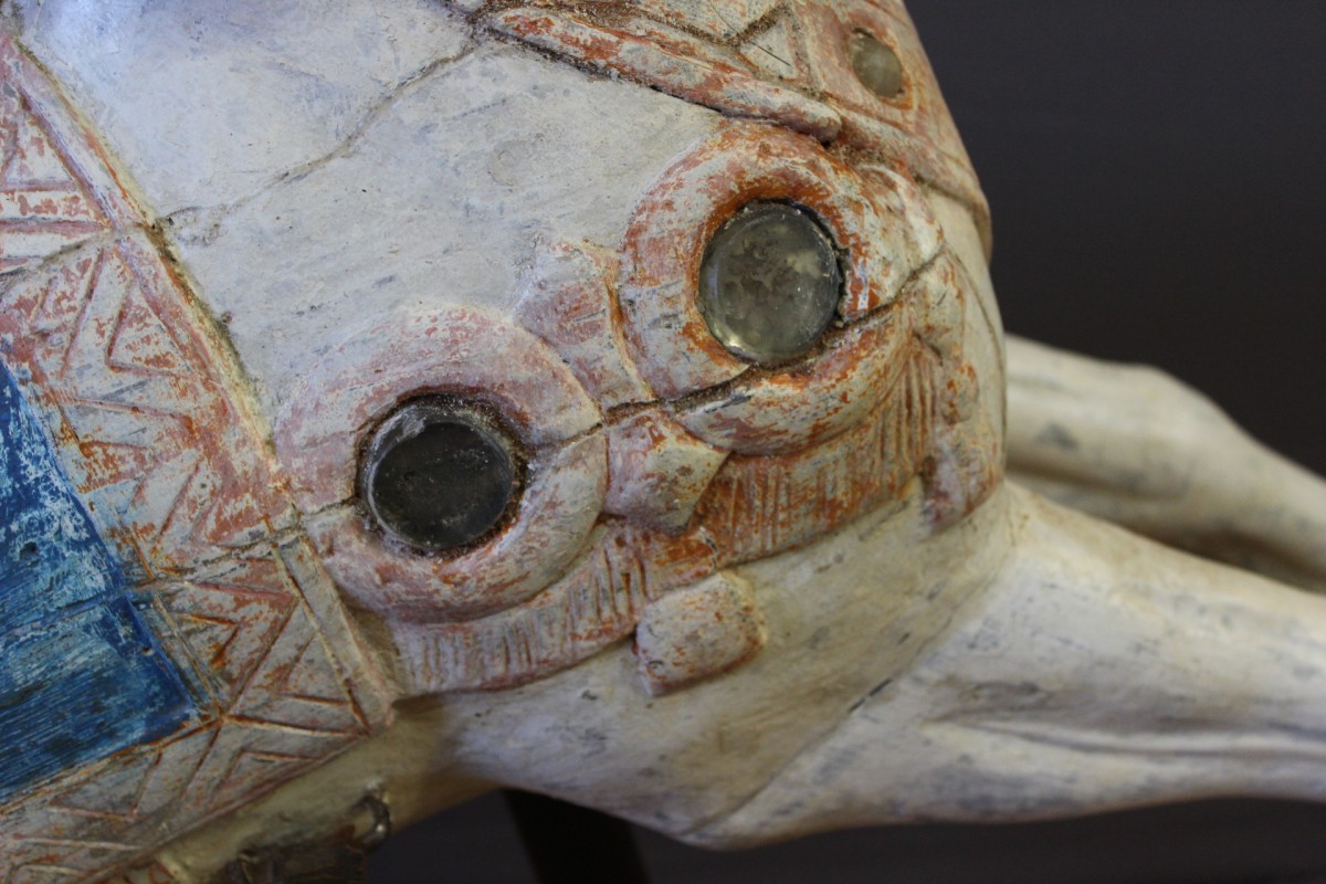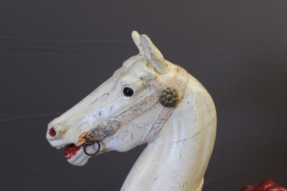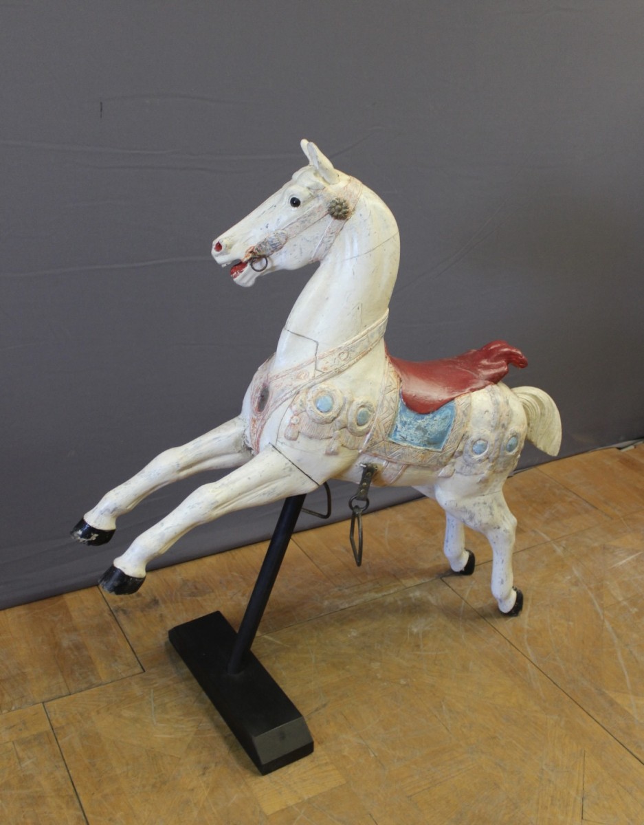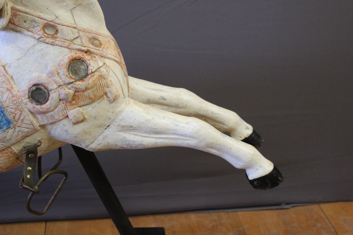 Cheval de manège en bois sculpté polychrome , hauteur sans le socle 83 cm , époque finXIX , ensemble en très bon état