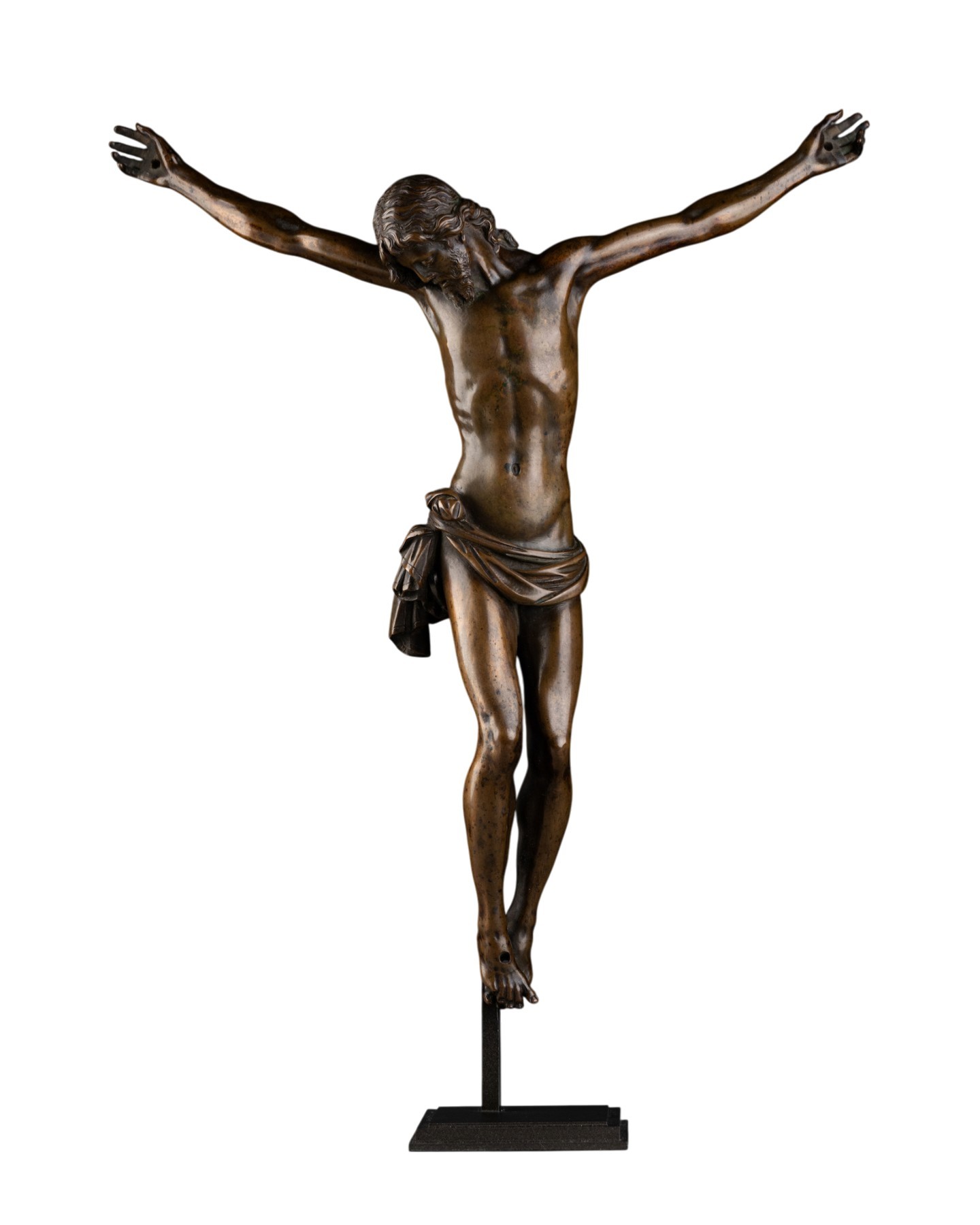 Le Christ est figuré les bras étendus en croix, la tête inclinée vers l’avant, les yeux clos dans la mort. Les proportions allongées sont adoucies par un subtil contrapposto : le torse s’incline délicatement vers la tête abaissée, les jambes se vrillent avec le pied droit légèrement relevé, tandis que le rythme général est animé par les plis frémissants du perizonium noué avec vigueur sur la hanche. Le corps conserve une souplesse retenue ; les détails finement repris au ciselet — cheveux, barbe, ongles — contrastent avec le modelé lisse ...