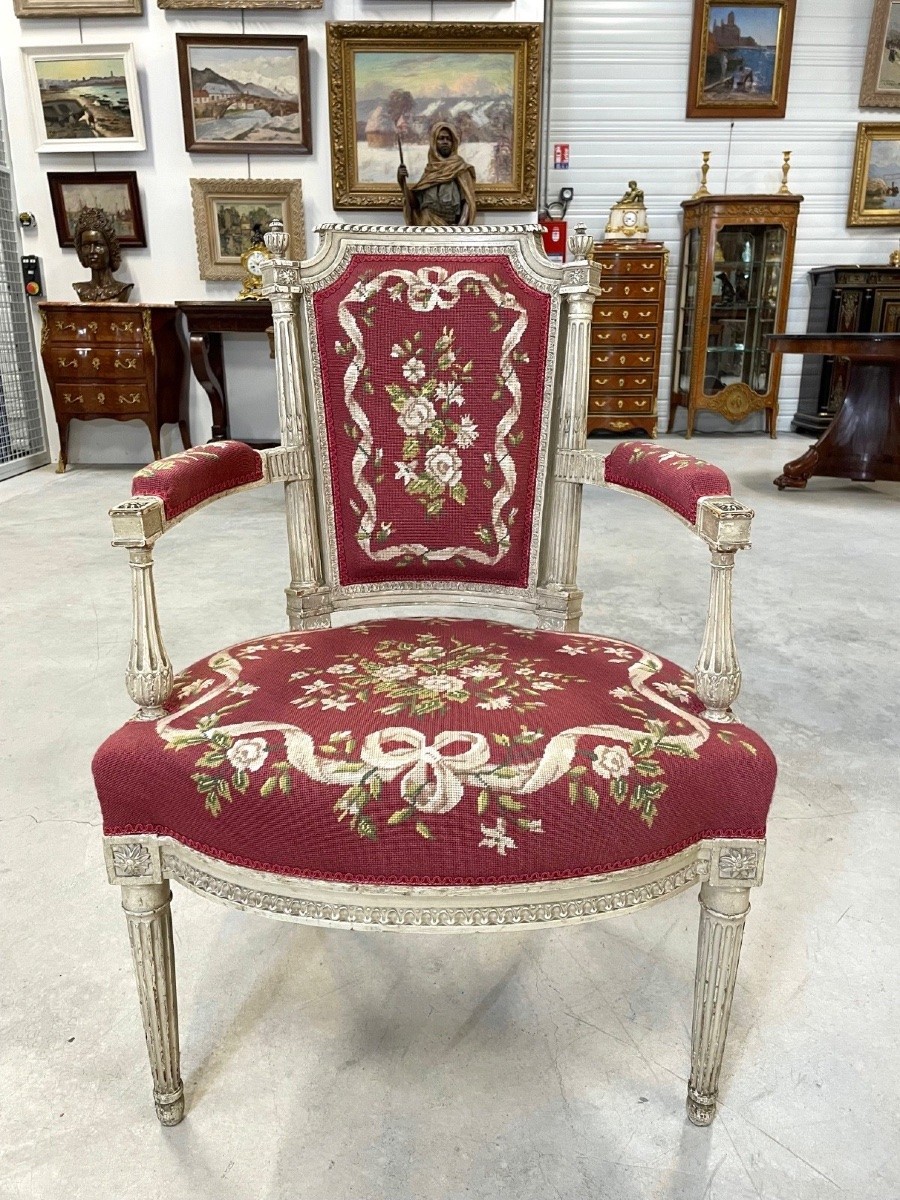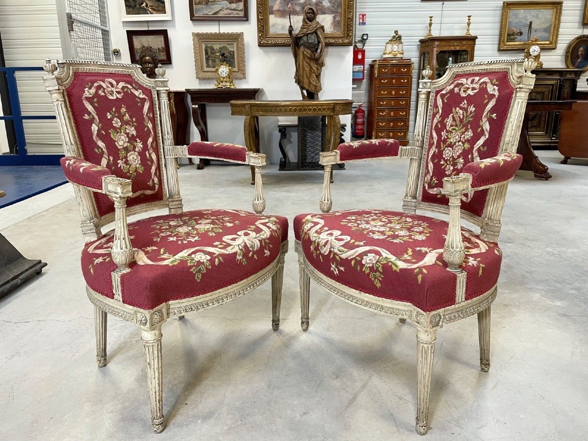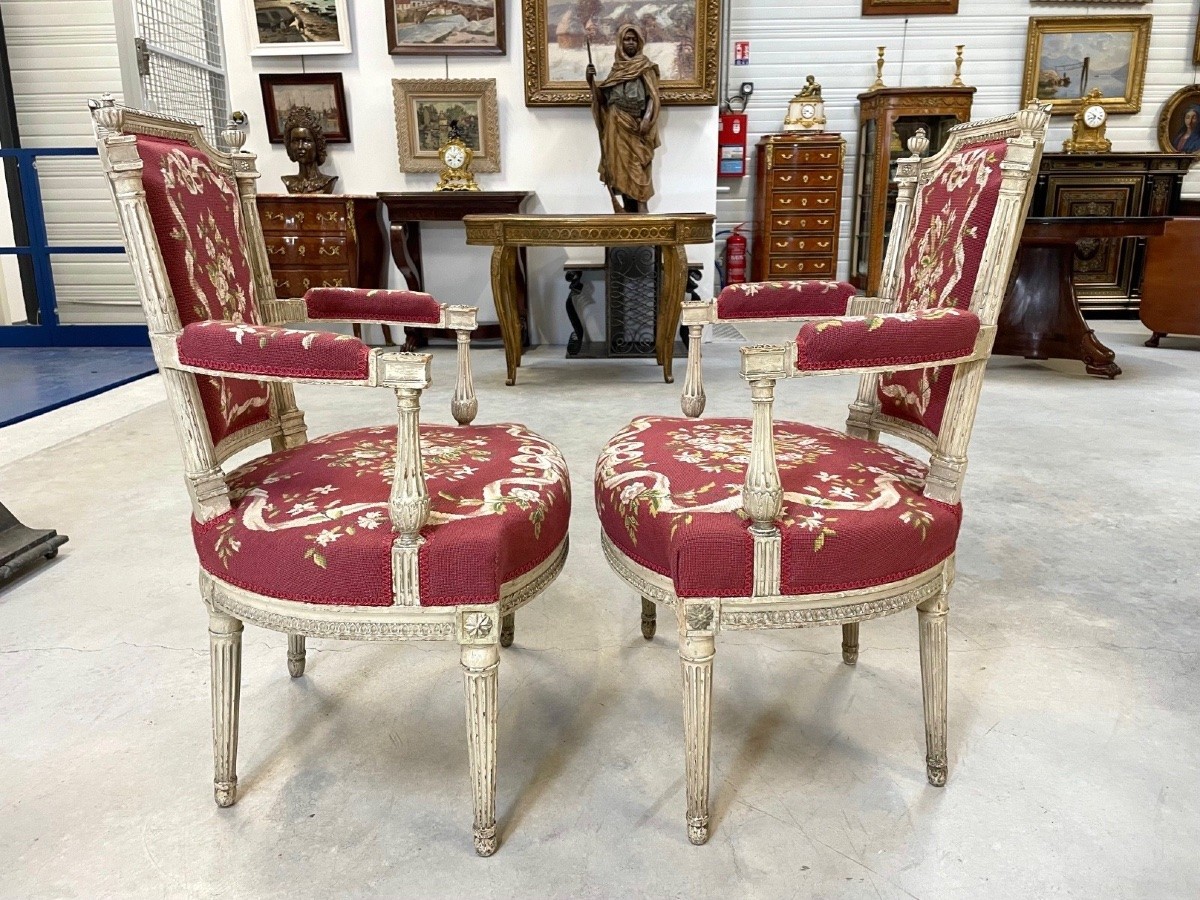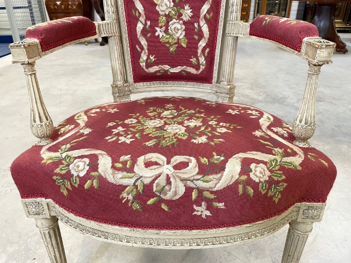 Retrouver le mobilier ou les objets d''art similaires à « Cinq fauteuils peints époque Directoire » présenté par Antiquités Saint Jean, antiquaire à Villeurbanne dans la catégorie Fauteuil & Bergère Directoire, Sièges.