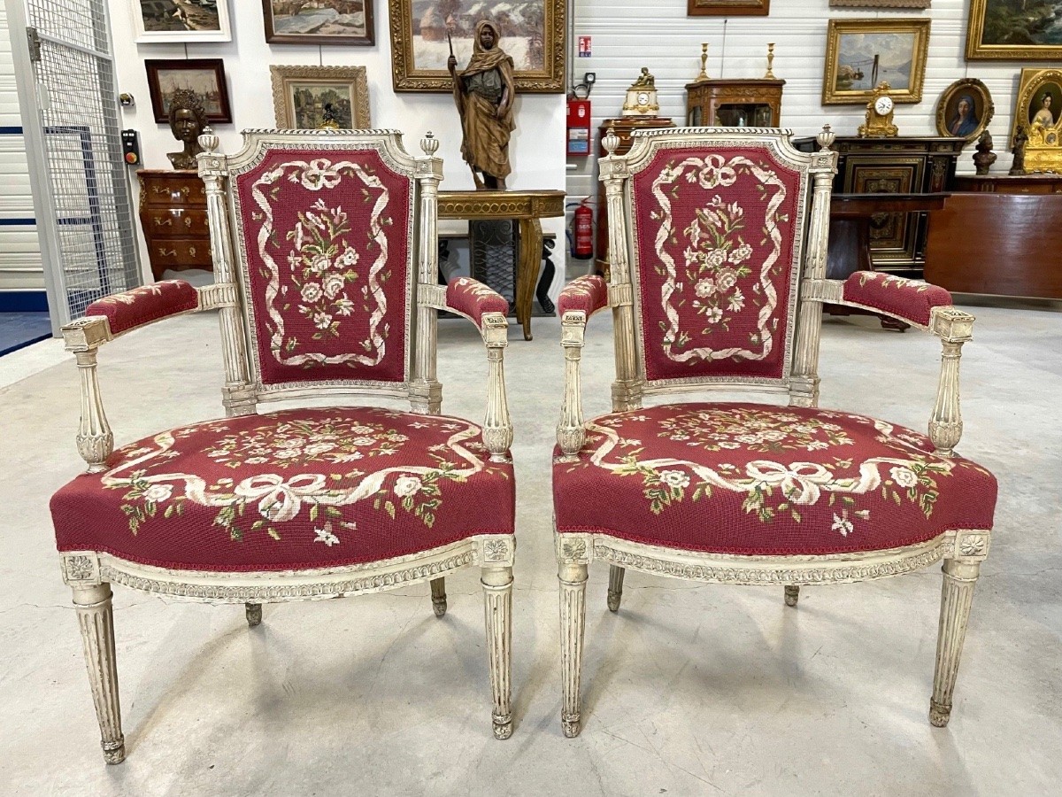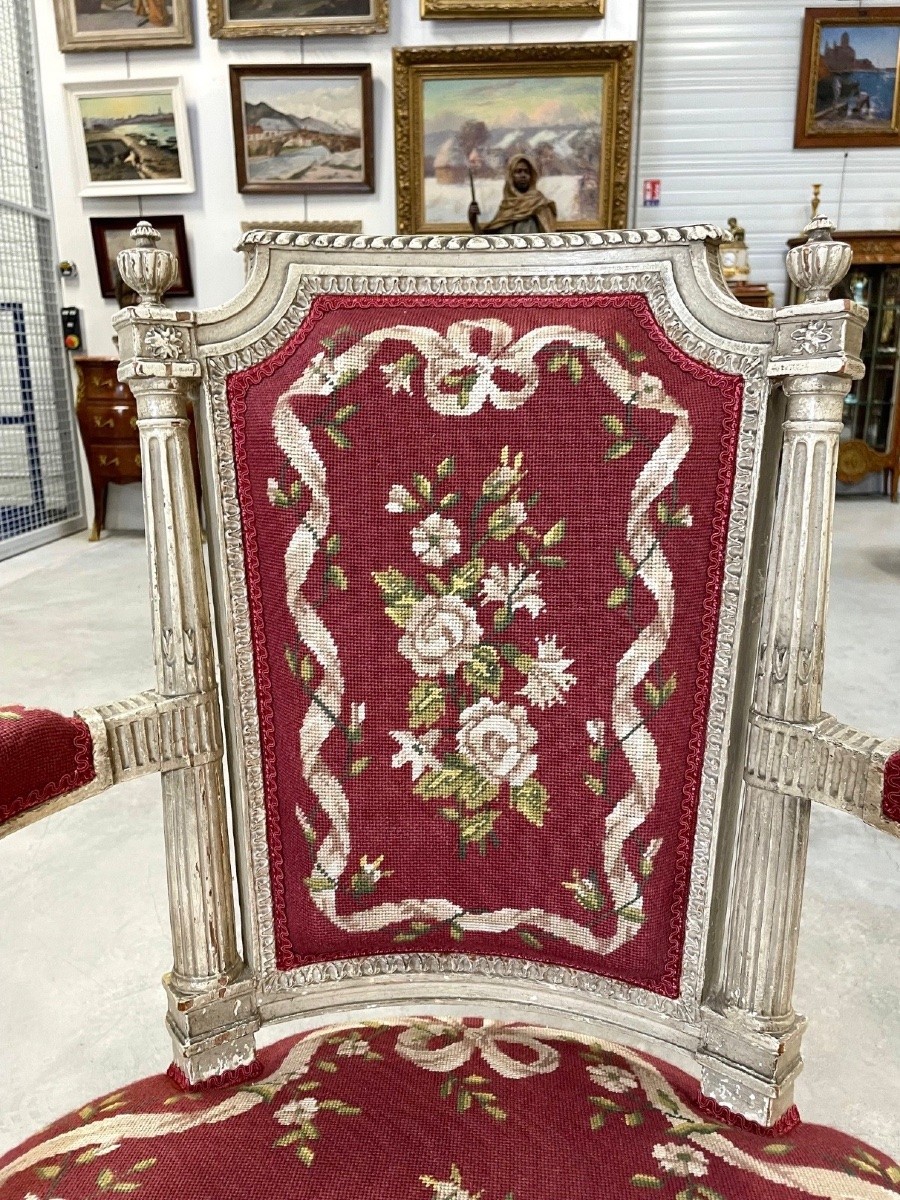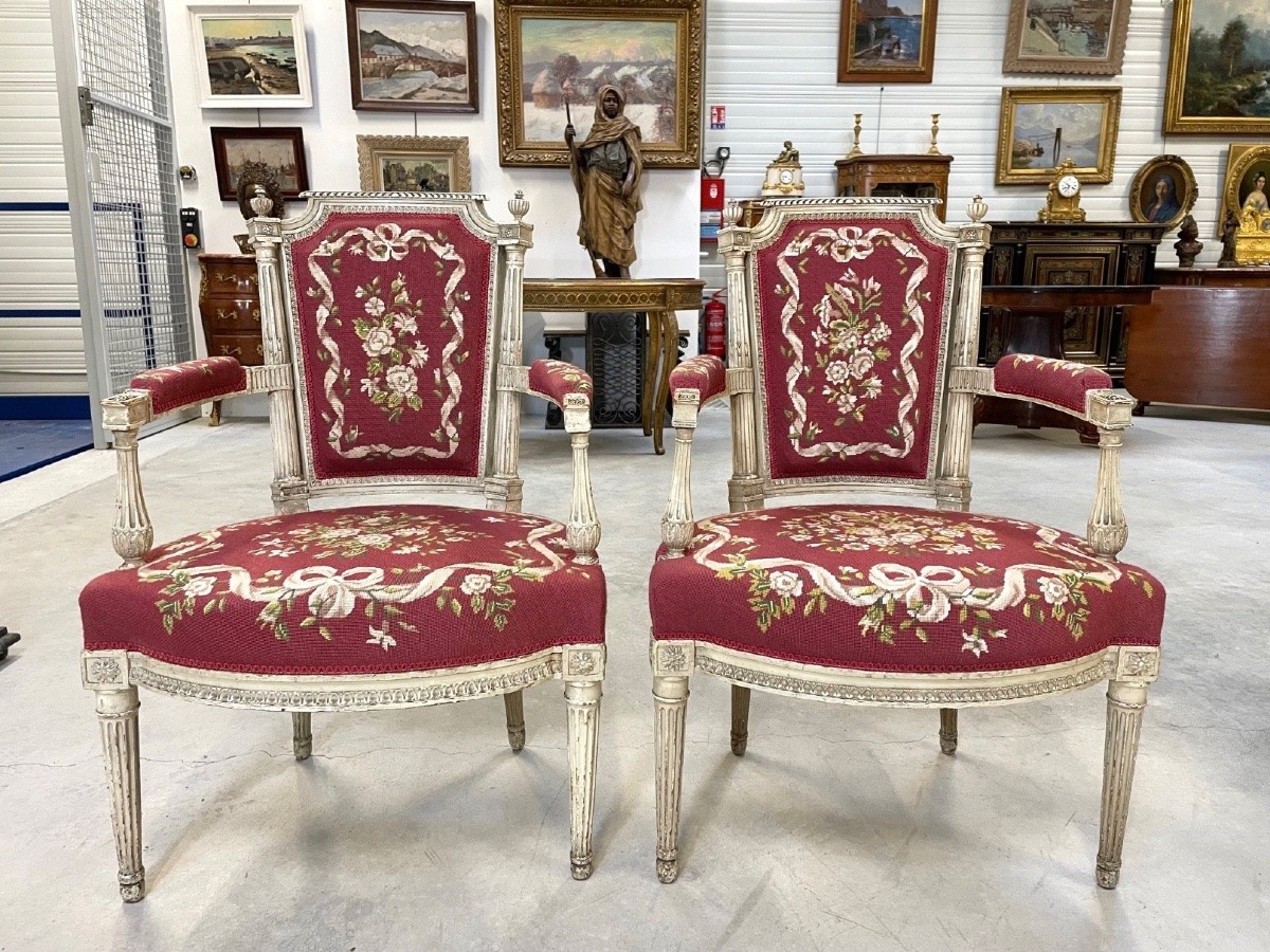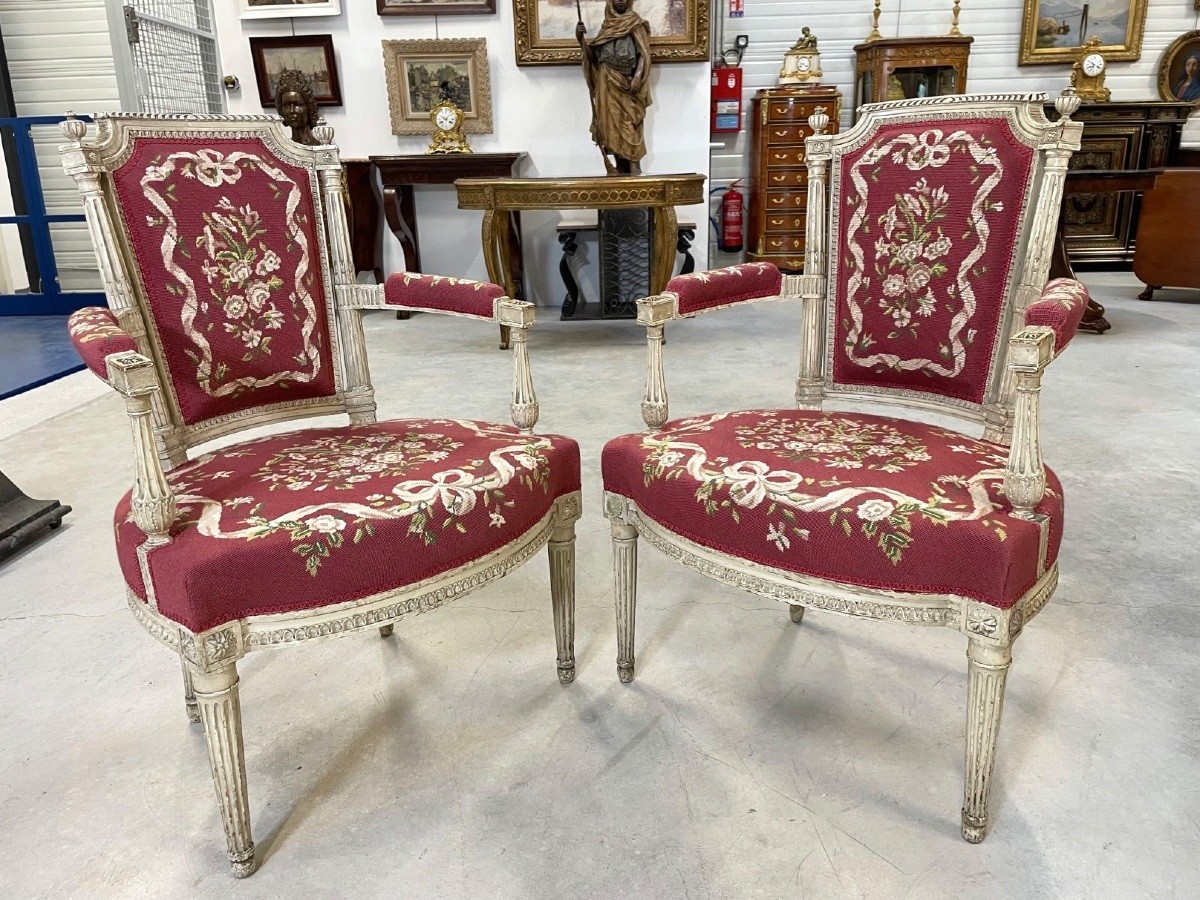 Retrouver le mobilier ou les objets d''art similaires à « Cinq fauteuils peints époque Directoire » présenté par Antiquités Saint Jean, antiquaire à Villeurbanne dans la catégorie Fauteuil & Bergère Directoire, Sièges.