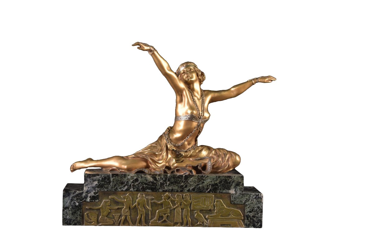 UNE CLAIRE-JEANNE-ROBERTE COLINET (1880-1950) BRONZE DORÉ ET PEINT À FROID, DANSEUSE THÉBAIN', VERS 1925 : Fondée d'après modèle et représentant une femme portant un costume exotique, bandeau et perles, sur un socle en marbre à gradins avec Frise "égyptienne", gravée C.J. R. Colinet. Dimensions : H : 58,5 cm, L : 53,5 cm, P : 20 cm.