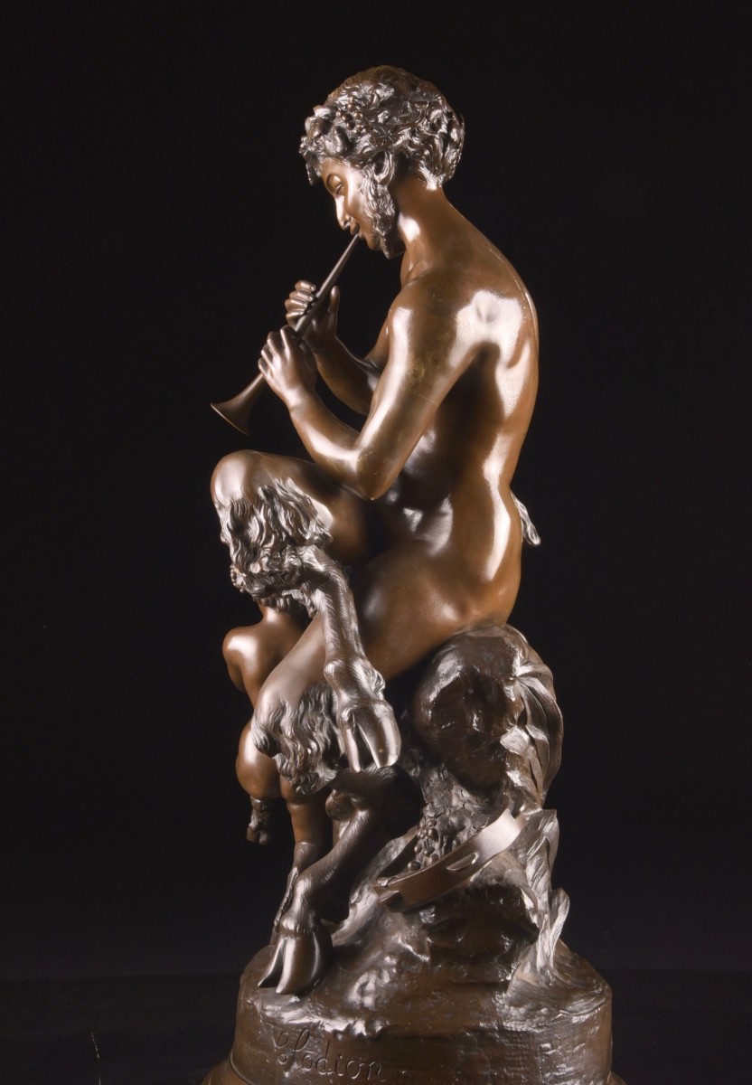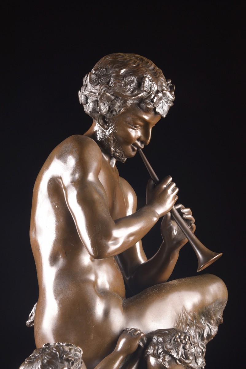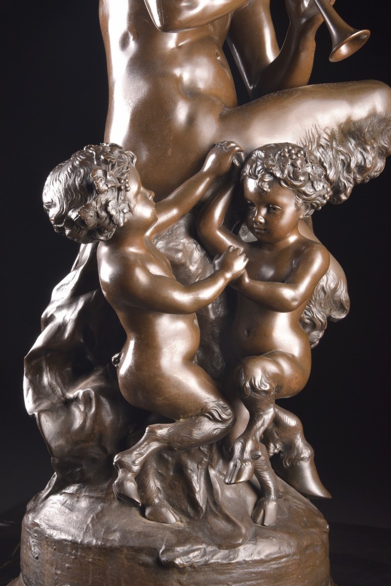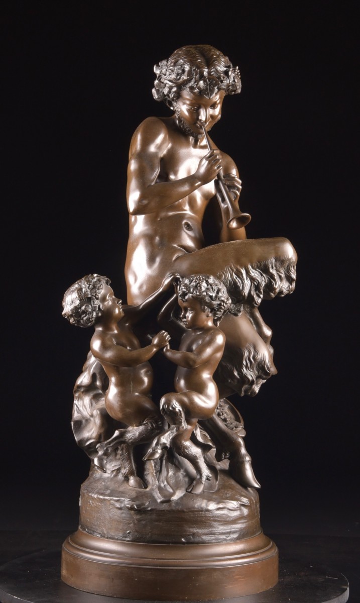 Cette imposante sculpture en bronze du célèbre sculpteur français Claude Michel, dit Clodion, présente une composition magistrale inspirée du monde arcadien des faunes, de la mythologie et de l’imaginaire pastoral. Réalisée avec une finesse remarquable, l’œuvre représente un faune assis jouant de la flûte, le visage concentré sur sa mélodie. Autour de lui, deux jeunes faunes dansent et se blottissent contre sa jambe, leurs gestes pleins de vivacité et leurs traits délicatement modelés incarnant le charme et la spontanéité ludique si caractéristiques de l’art de Clodion. La sculpture témoigne d’un modelé exceptionnel, depuis les chevelures finement détaillées et les textures des pelages jusqu’au rendu subtil de l’anatomie. La patine brune profonde enrichit les volumes, accentue les jeux de lumière et souligne la fluidité presque musicale de la composition. Monumentale par son échelle et sa présence, cette œuvre constitue un exemple remarquable ...