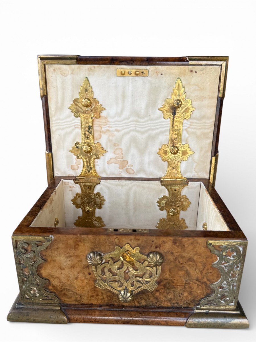 Rare coffret à sirih en bois d’amboyna, travail de Batavia (Jakarta), XVIIIe siècle, richement orné de montures en bronze ciselé et doré au feu.