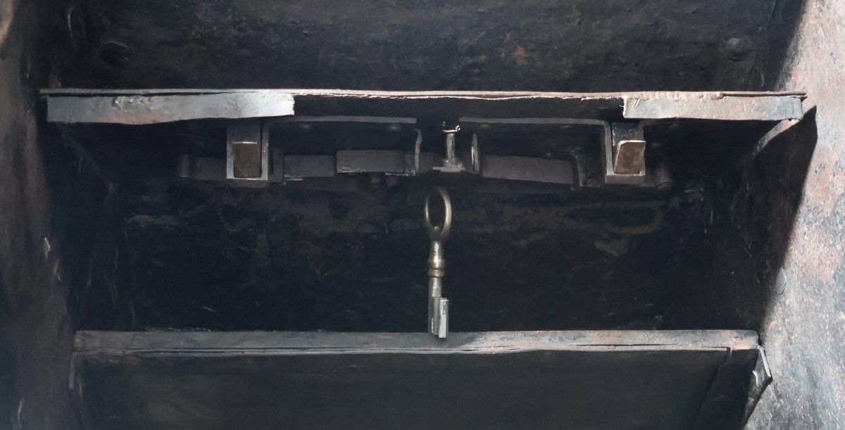 Équipé d’un ingénieux système de fermeture à 7 pênes et 3 crochets, avec fausse et vraie serrure dissimulées ainsi que 2 cadenas (postérieurs marque Fichet)) en façade avec clés