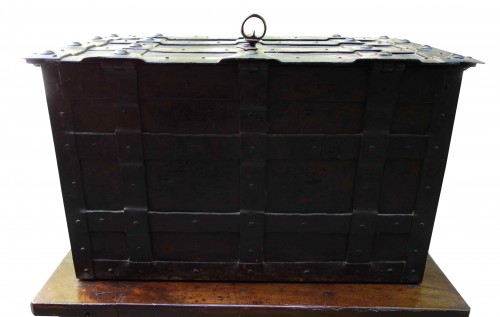 La façade est ornée d’une fausse entrée de serrure pour retarder toute effraction. Les importantes poignées permettent de transporter ce coffre.