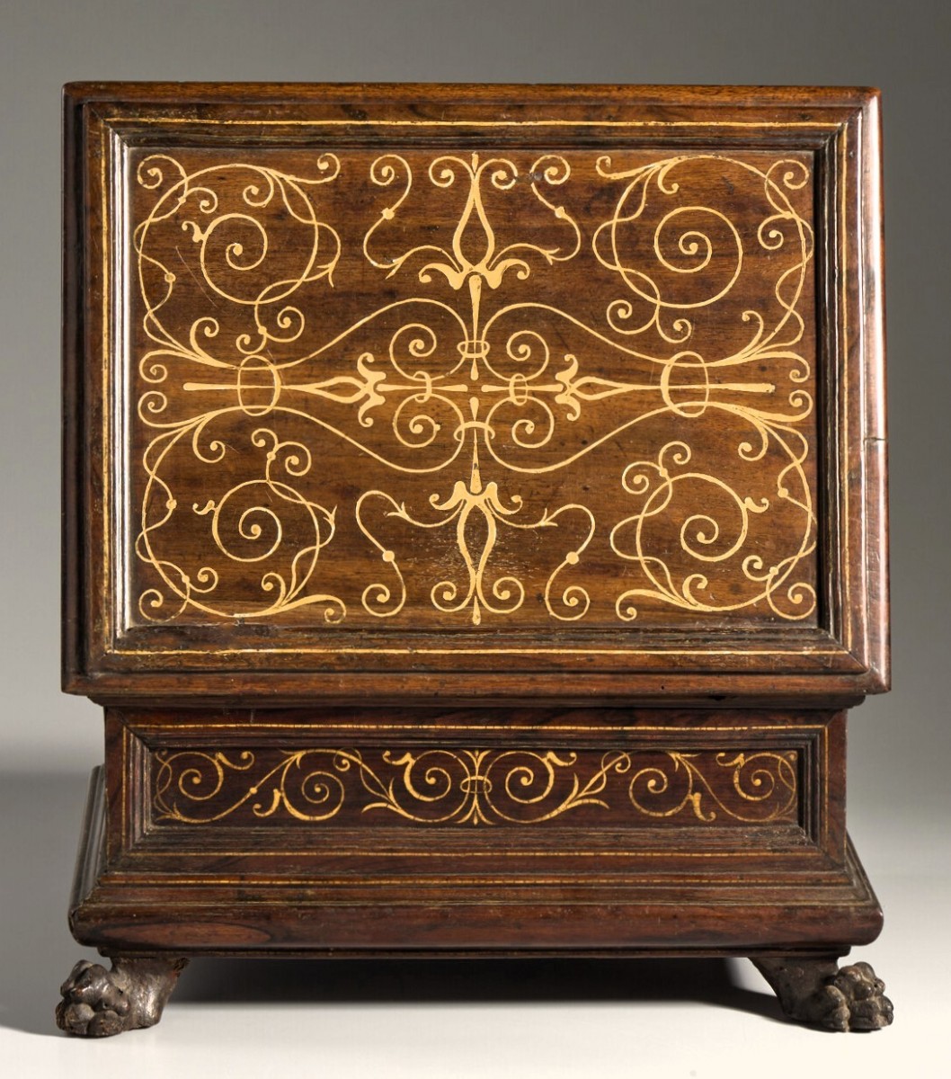 Ses lignes austères, accentuées par les quatre pattes félines qui le soutiennent, sont adoucies par un délicat décor de volutes en ivoire qui s'étend sur toute sa surface, encadrée de panneaux richement ornés.