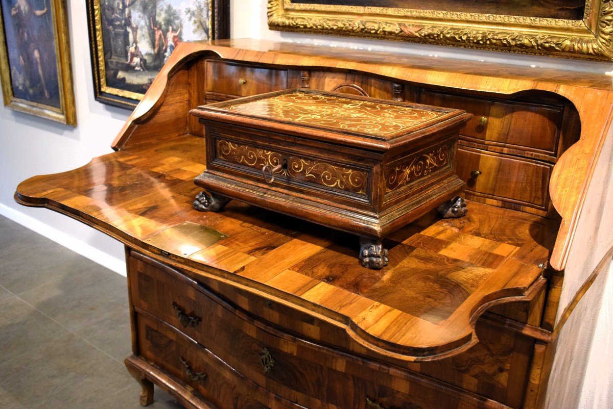 Les proportions de cette précieuse pièce sont splendides, parfaitement adaptées à sa fonction de coffre de courtoisie, destiné à contenir objets précieux et lettres dans ses compartiments intérieurs.