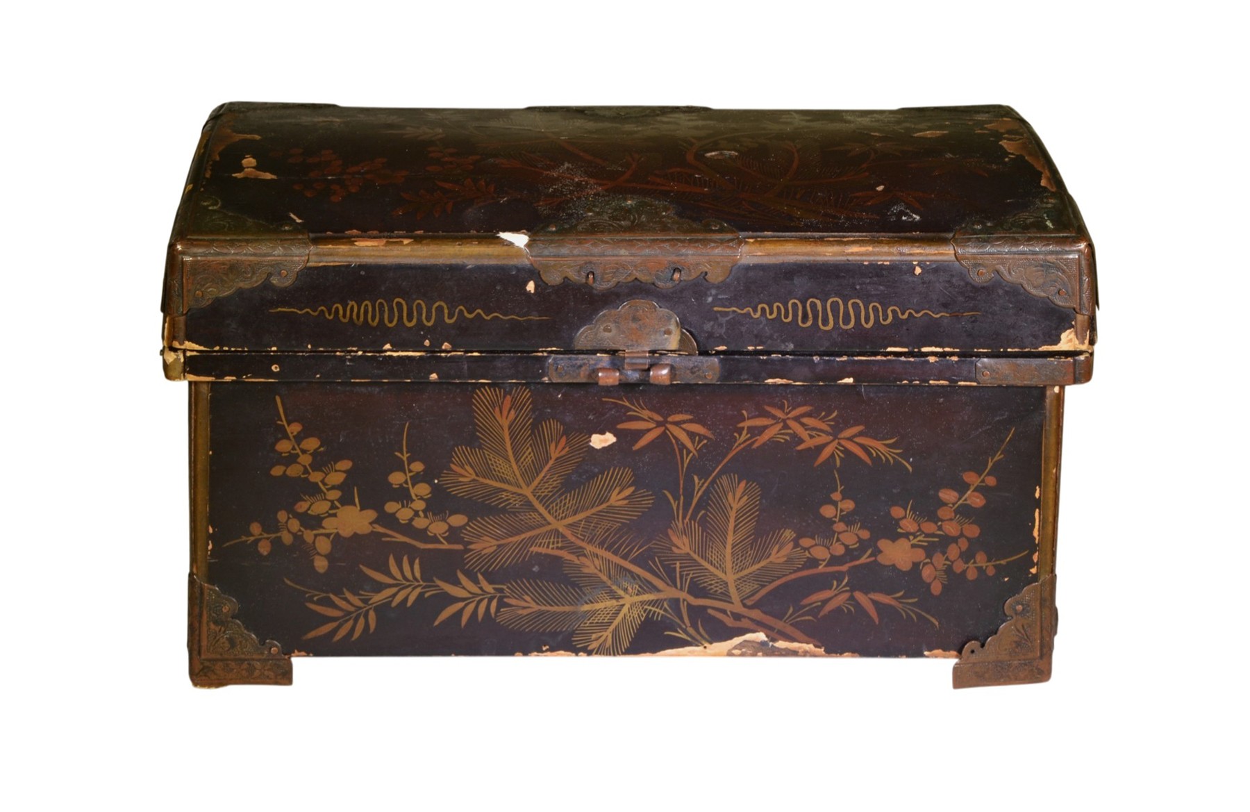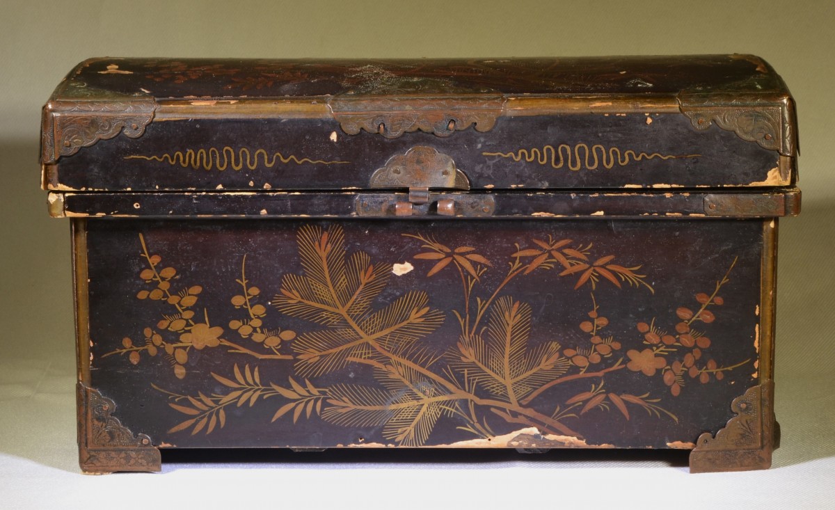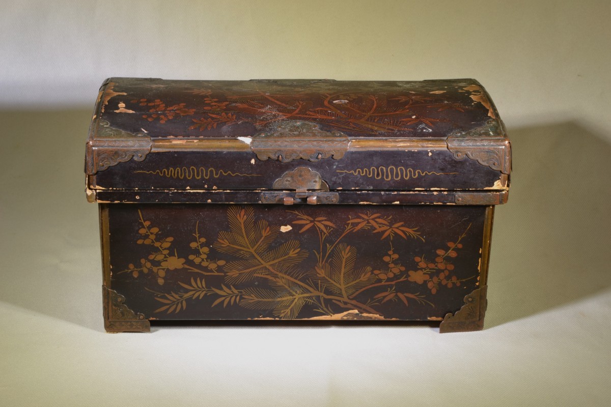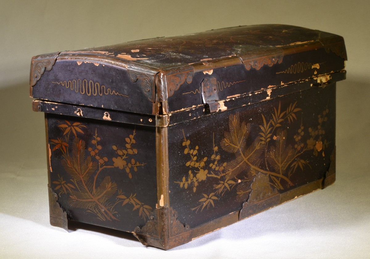 ... dans de fines plaques de cuivre, sont ,elles aussi, dans leur simplicité technique dans l'esprit des créations de Muromachi; quand aux dessins incisés sur ces ferrures ils sont différents de ceux ,standardisés, rencontrés sur les ferrures Momoyama. Il s'agit là d'une des toutes premières créations japonaises pour l'exportation vers le Portugal exécutées vers 1550-60. Il est rarissime de rencontrer une laque de style Namban de cette période, la plupart des Namban étant bien plus tardives, certaines datant même du début du 17° siècle. L'intérieur fût doublé d'un mauvais tissu. De nombreux dégâts qui, fort heureusement, ne furent jamais restaurés. 25 x 13x 14cm.