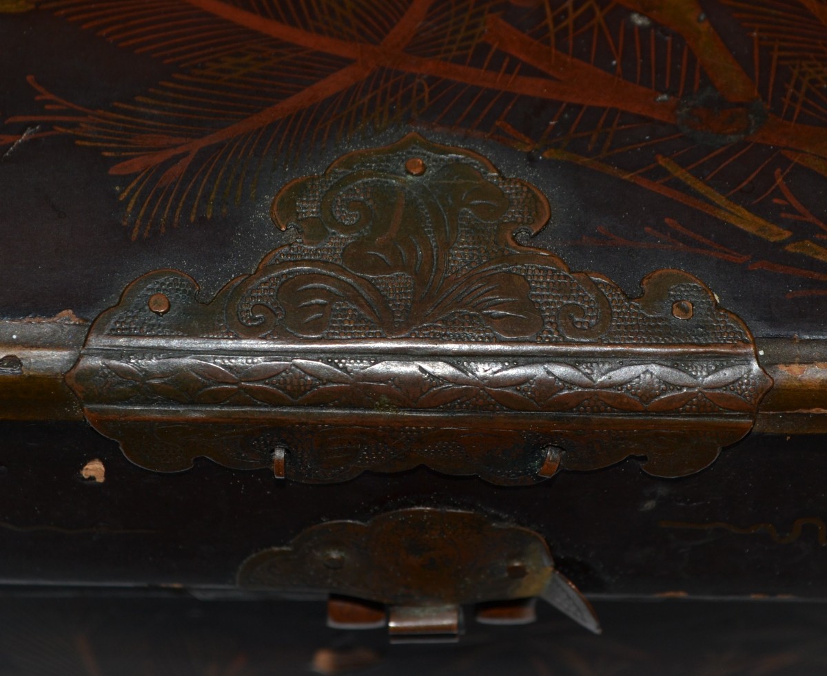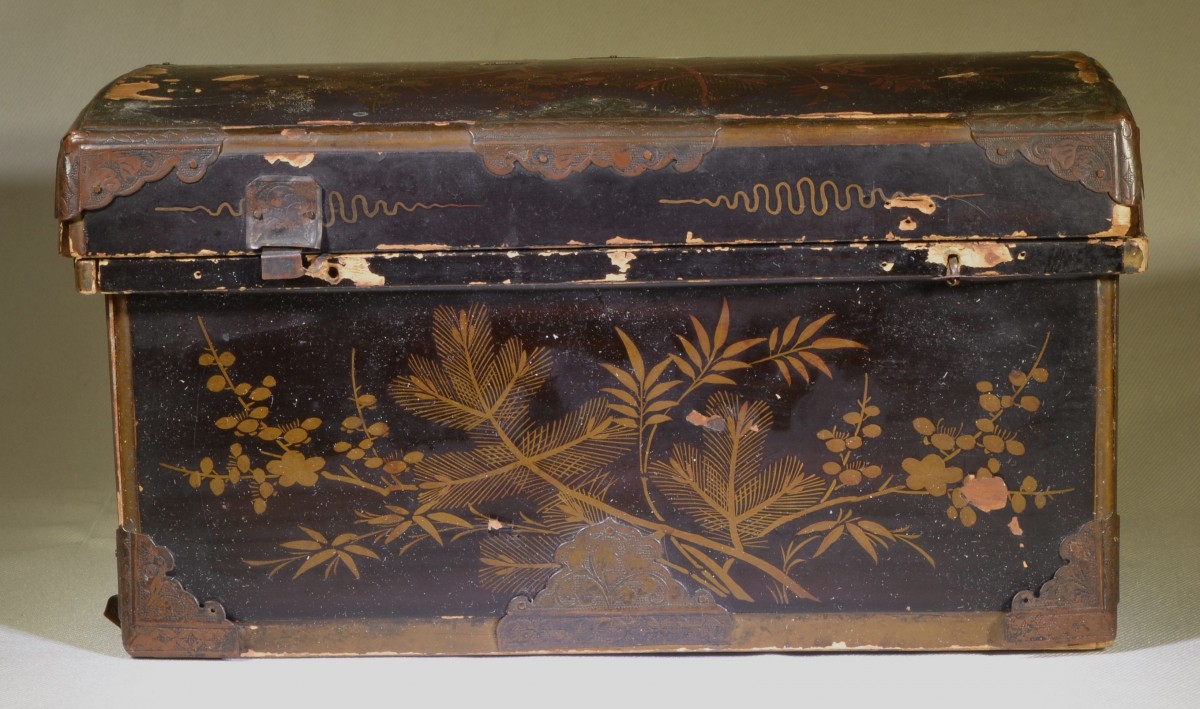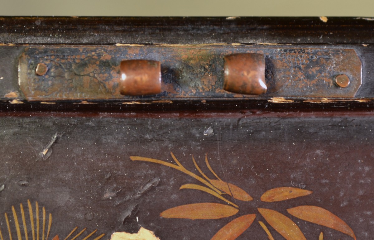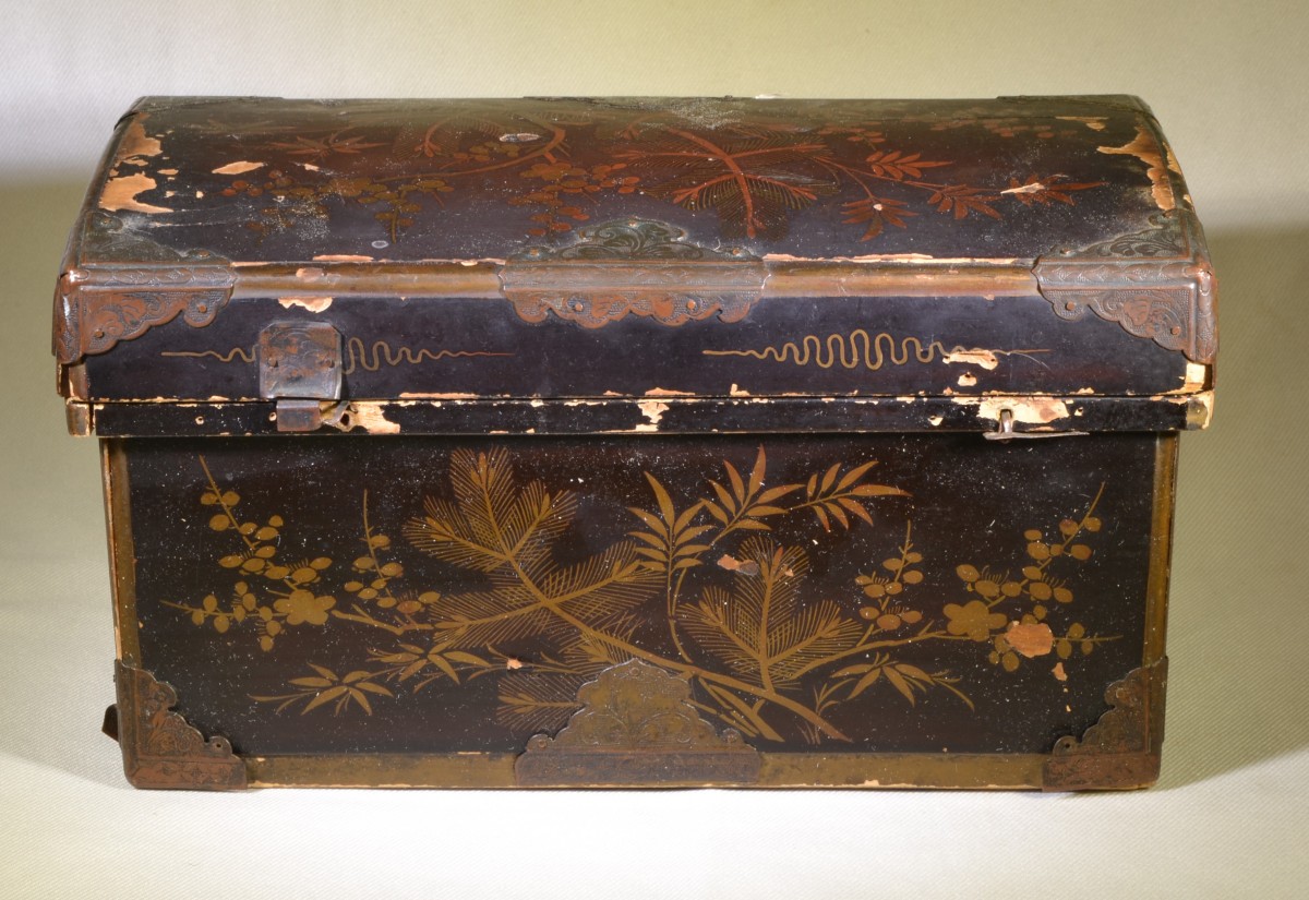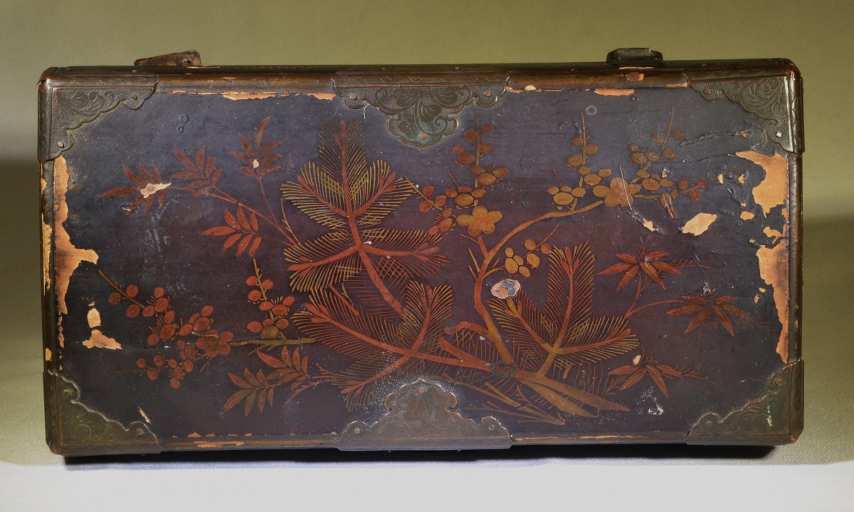 ... dans de fines plaques de cuivre, sont ,elles aussi, dans leur simplicité technique dans l'esprit des créations de Muromachi; quand aux dessins incisés sur ces ferrures ils sont différents de ceux ,standardisés, rencontrés sur les ferrures Momoyama. Il s'agit là d'une des toutes premières créations japonaises pour l'exportation vers le Portugal exécutées vers 1550-60. Il est rarissime de rencontrer une laque de style Namban de cette période, la plupart des Namban étant bien plus tardives, certaines datant même du début du 17° siècle. L'intérieur fût doublé d'un mauvais tissu. De nombreux dégâts qui, fort heureusement, ne furent jamais restaurés. 25 x 13x 14cm.