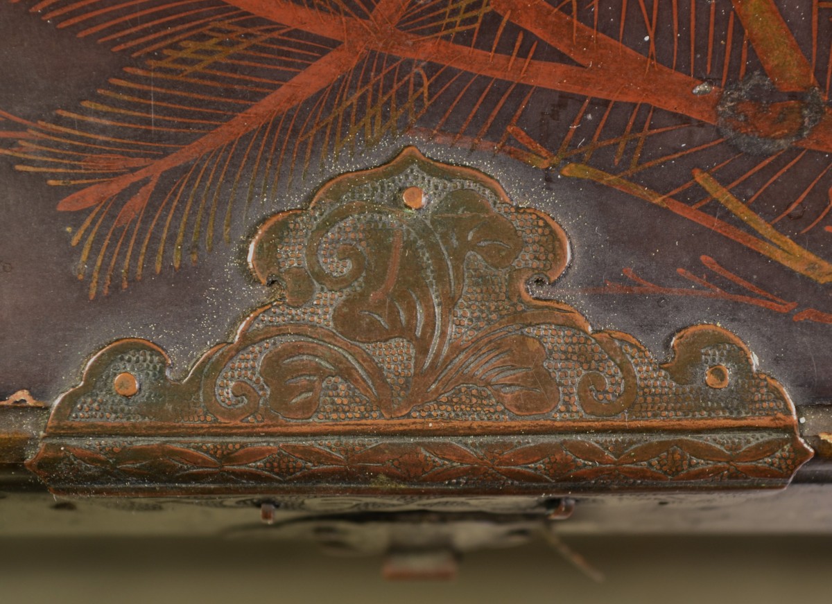 Le coffret est en bois recouvert de laque Urushi, décoré de poudres métalliques. Les charnières et angles de renfort sont en cuivre repoussé. Très important, un détail bien particulier permet de dater avec précision la période de création de ce coffret, il s'agit du motif serpentiforme dessiné en double sur les 4 faces du rebord du couvercle, en effet ce motif n'apparait que sur les laques japonaises d'exportation créées avant 1600 soit durant la période de Momoyama, ce motif, auparavant inconnu au Japon a dû y apparaitre sur les premières laques Namban vers 1550 durant la fin de la période de Muromachi (1336-1573), juste après l'arrivée des portugais en 1543.Le décor minimaliste, chargé de symbolisme, typiquement japonais avec ses "3 amis" (pin ,prunus et bambou) est dans la continuité des sobres laques Muromachi et n'a pas la magnificence ostentatoire des laques de la luxueuse période de Azuchi-Momoyama (1573-1603).De même les ferrures découpées aux ciseaux ...