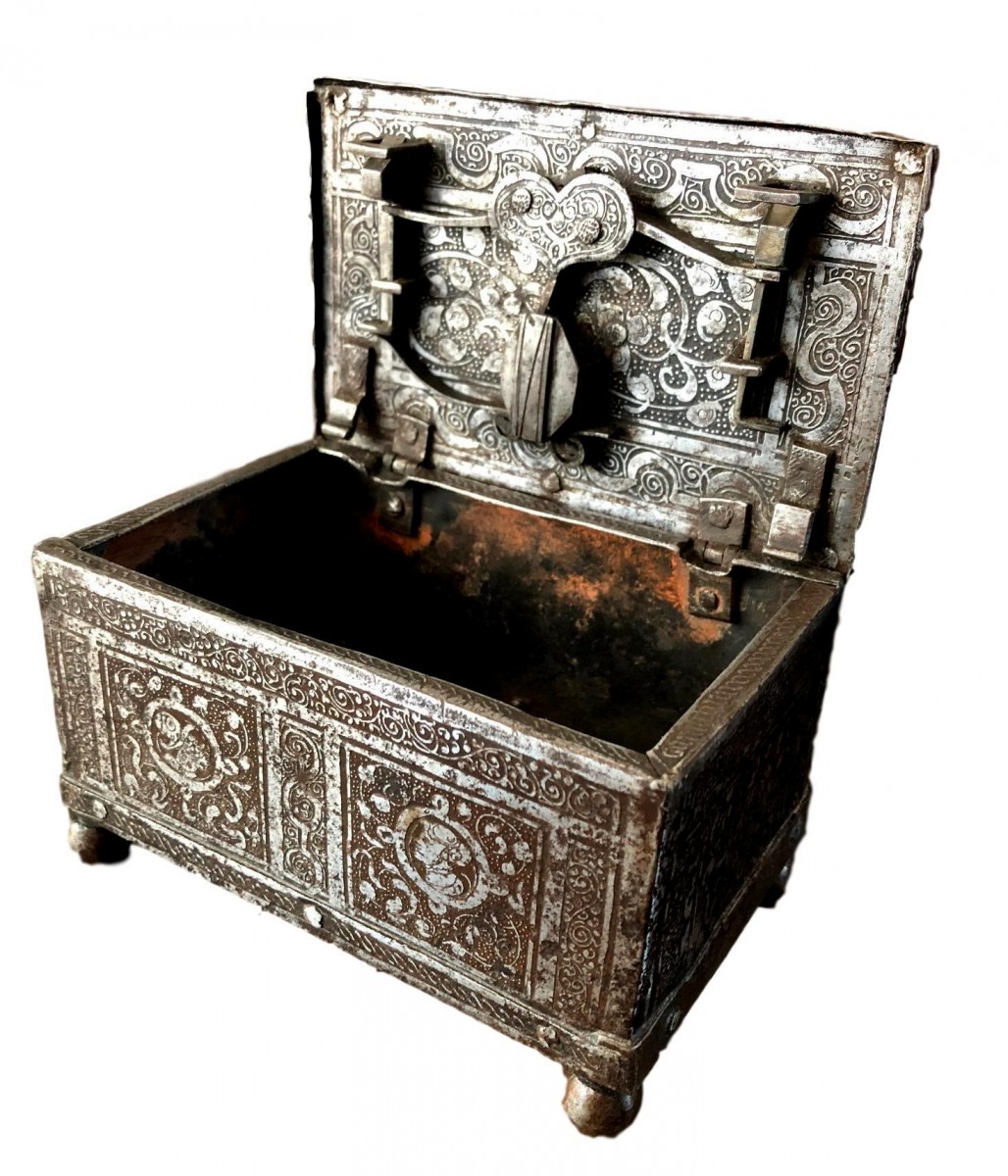 Un très beau coffret en fer gravé à l'eau-forte. Nuremberg. 2e moitié du XVIe siècle. Dim.: 14cm x 9cm x 8cm