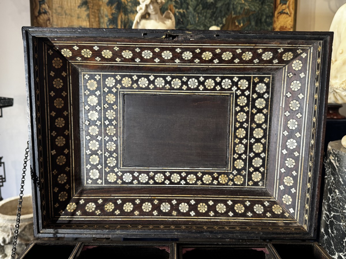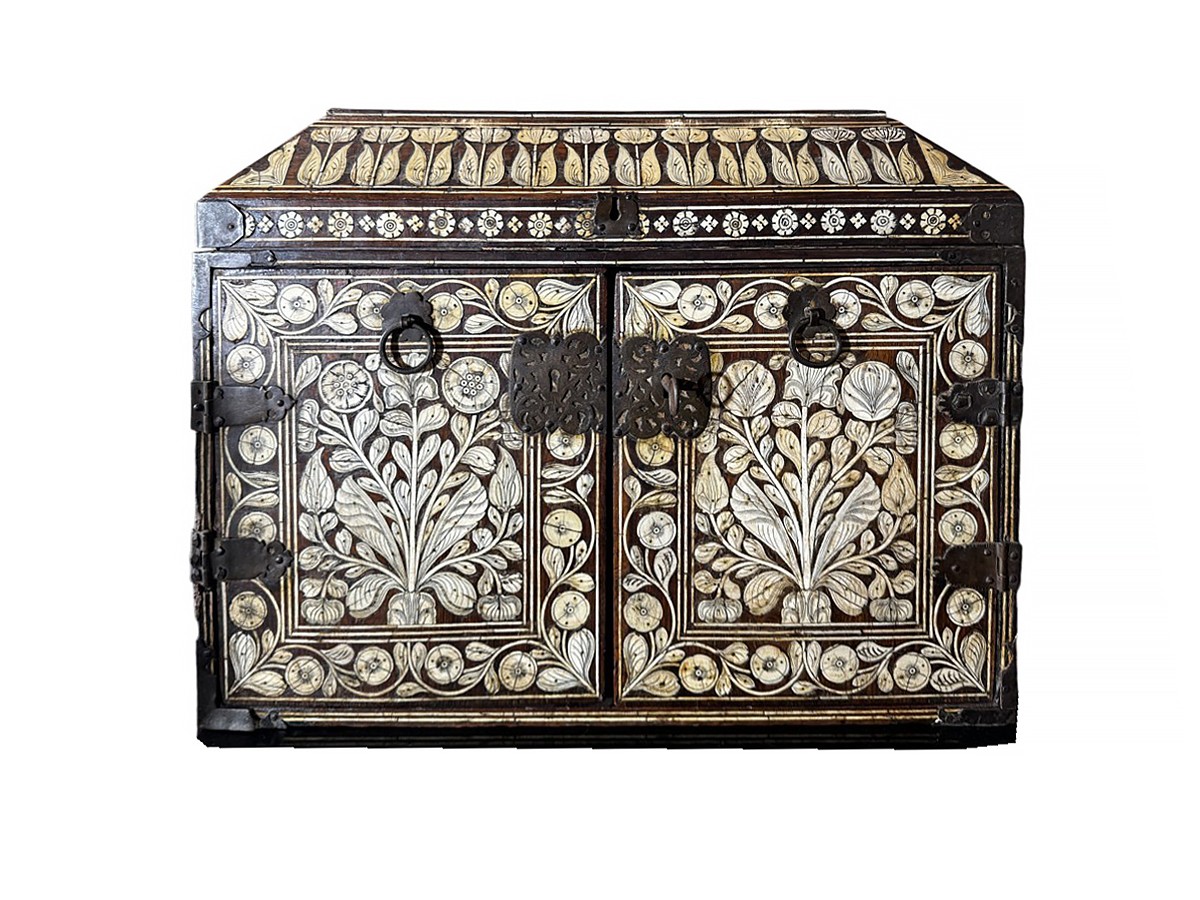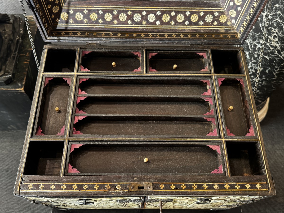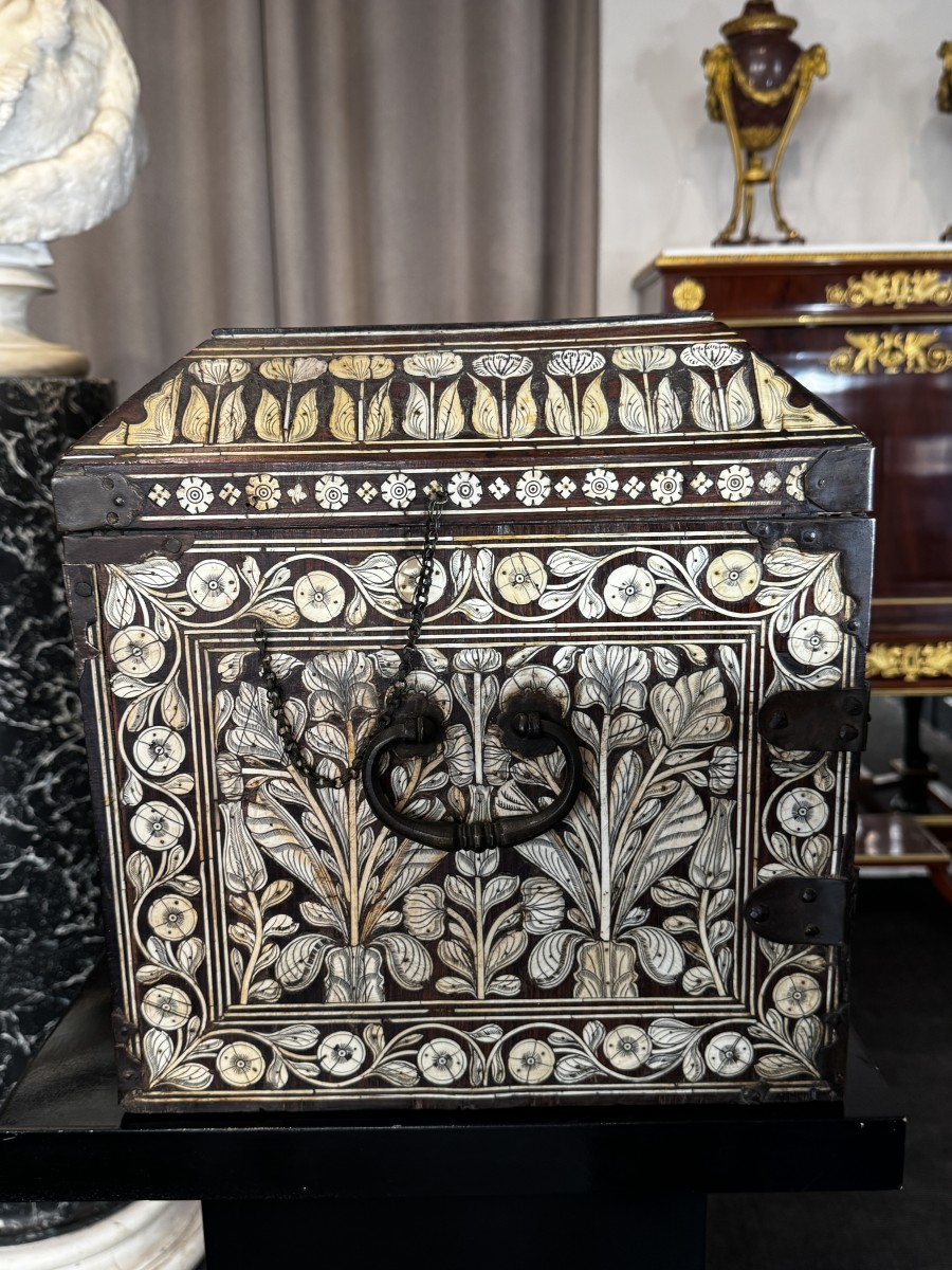 Grand coffret indo-portugais paré de toutes faces en marqueterie d'os à décor de feuillages et de fleurs.