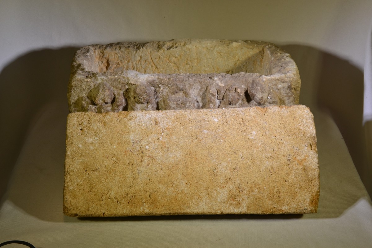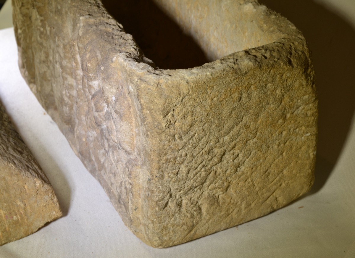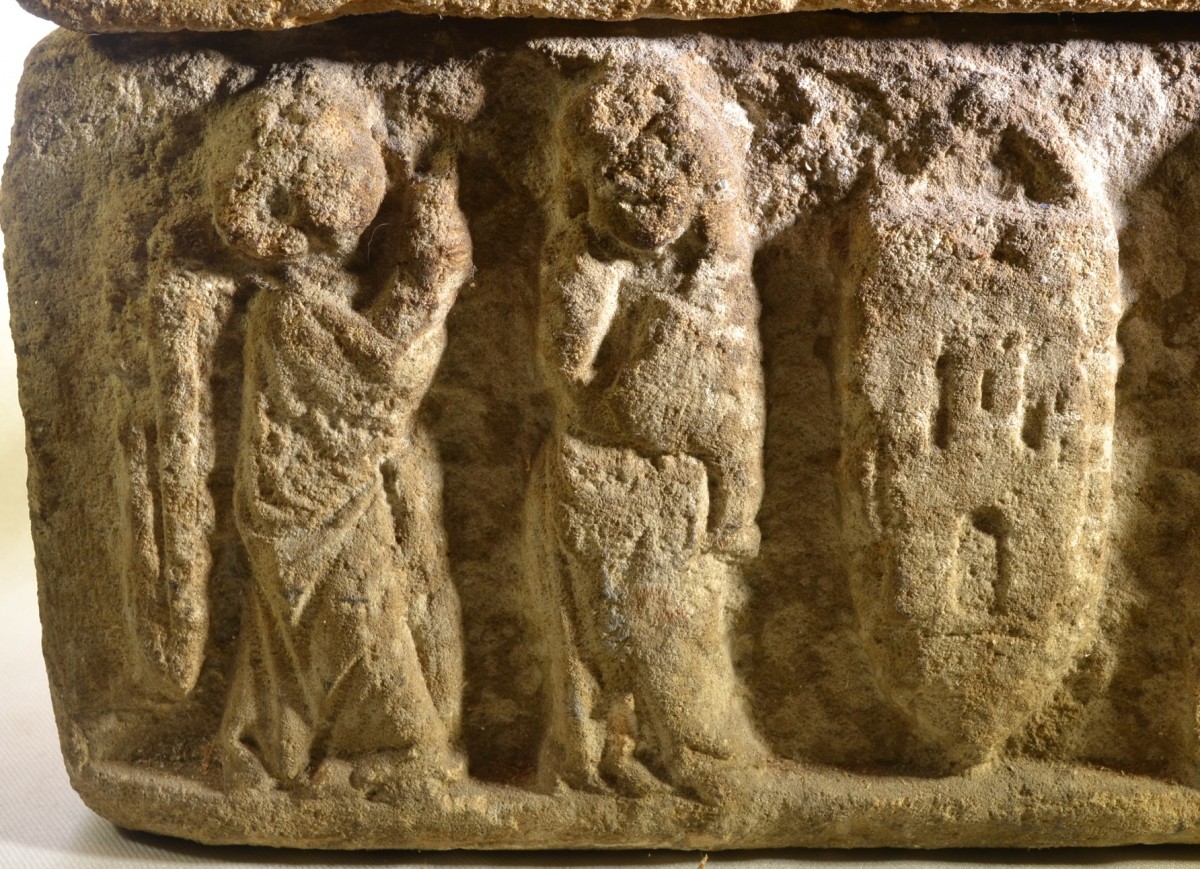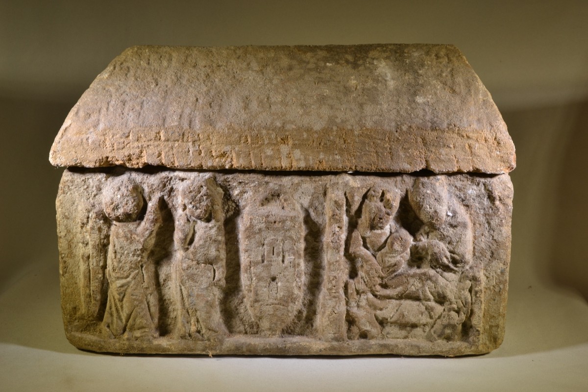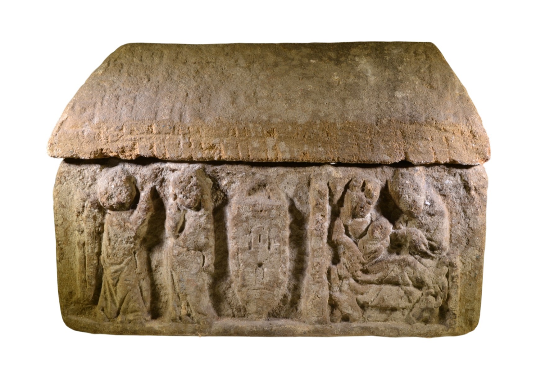 Ce petit coffre à double bâtière ,en pierre tendre sculptée devait servir soit de petit sarcophage soit d'ossuaire. Décor profondément sculpté sur une seule face qui illustre l'annonciation et la natalité. Sont représentés 5 personnages; sur la partie de gauche on distingue Marie allongée "à la romaine" sur une méridienne elle tient dans ses bras l'enfant Jésus qui est entièrement langé par des bandelettes à l'égyptienne, derrière eux Joseph est représenté debout. Sur la partie gauche de la façade l'ange Gabriel annonçant à Marie qu'elle est enceinte. Au milieu la ville représentée par des tours et des murailles est probablement Bethléem. Travail rustique d'un atelier régional roman, toutefois ,l'artiste a su donner vie à tous ses personnages. La pierre utilisée, vue à la loupe est formée par un agglomérat de petits grains de roche parsemés de paillettes brillantes de quartz ou de mica; c'est un grés calcarifère, typique de la Suisse et de la ...