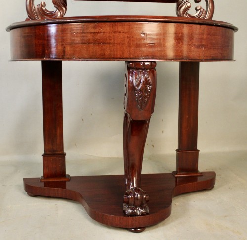 Retrouver le mobilier ou les objets d''art similaires à « Coiffeuse demi-lune en acajou » présenté par Jean-Yves Buhard, antiquaire à Saint André sur Vieux Jonc dans la catégorie Coiffeuse Restauration - Charles X, Mobilier.