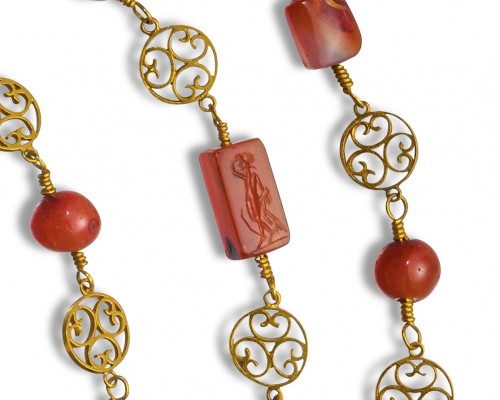 Un collier à longue chaîne en or de renaissance archéologique avec d'anciennes perles d'intaille en cornaline.