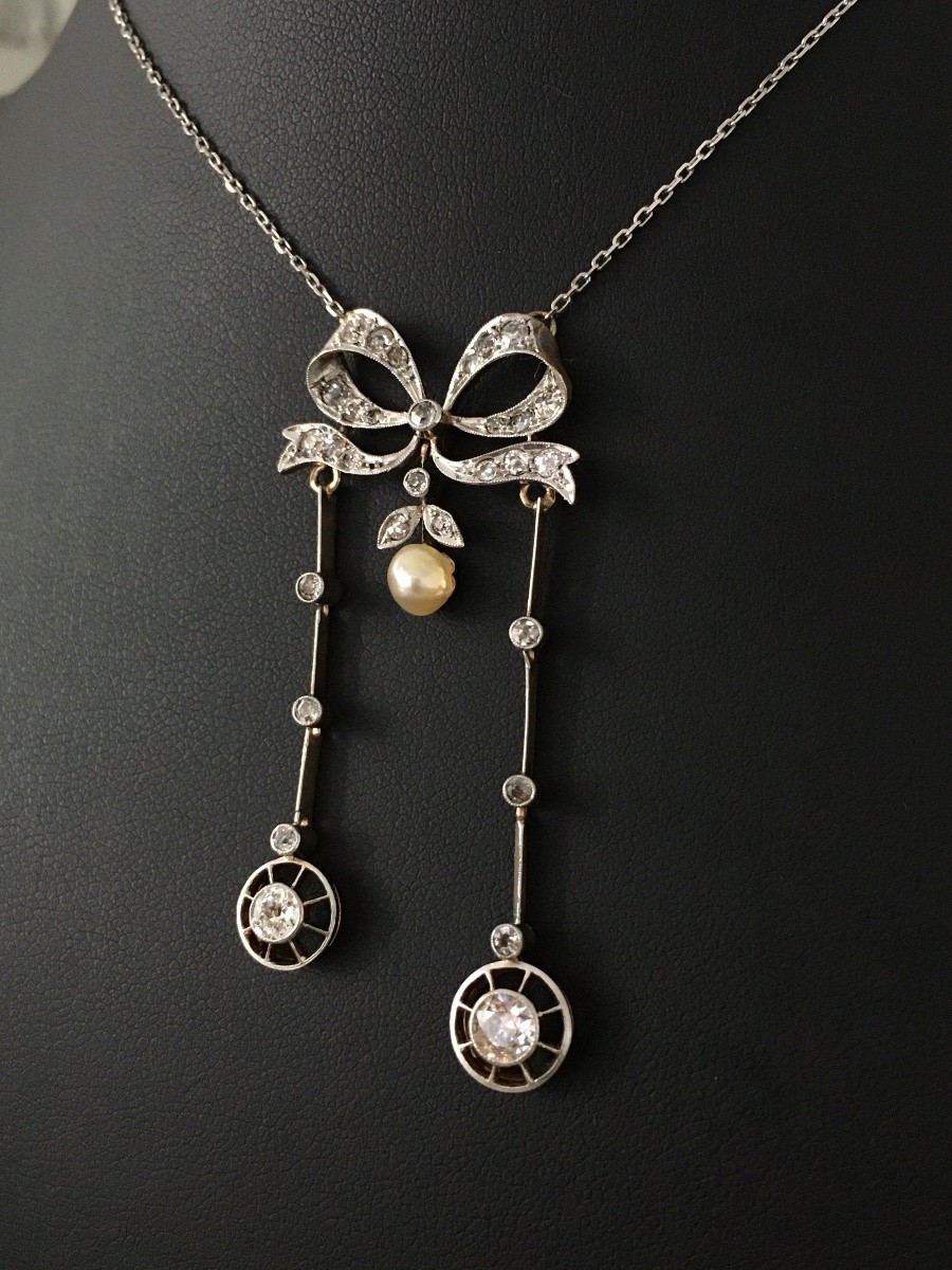 Deux diamants taille ancienne aux extrémités articulées du pendentif complètent l’ouvrage, un pour environ 0,30 ct et l’autre à 0,20 ct environ.