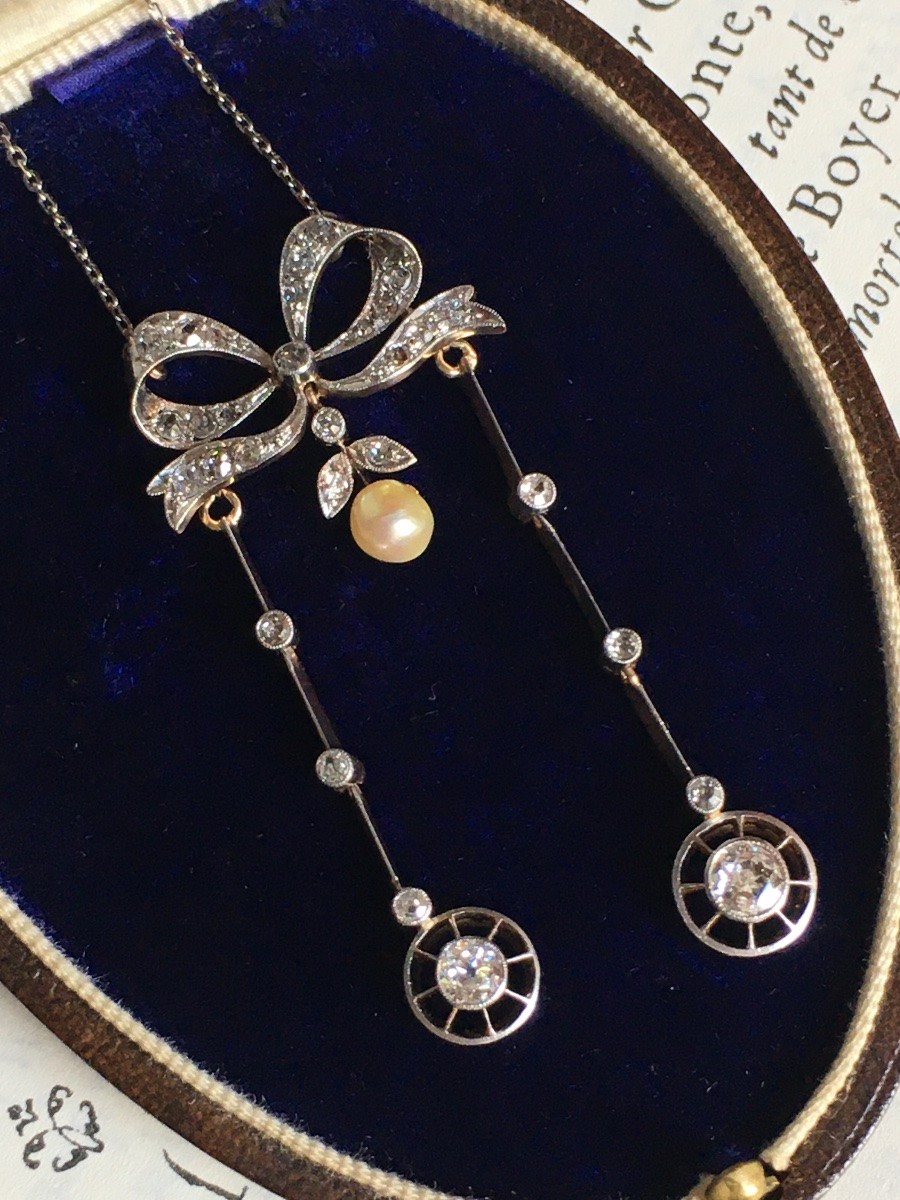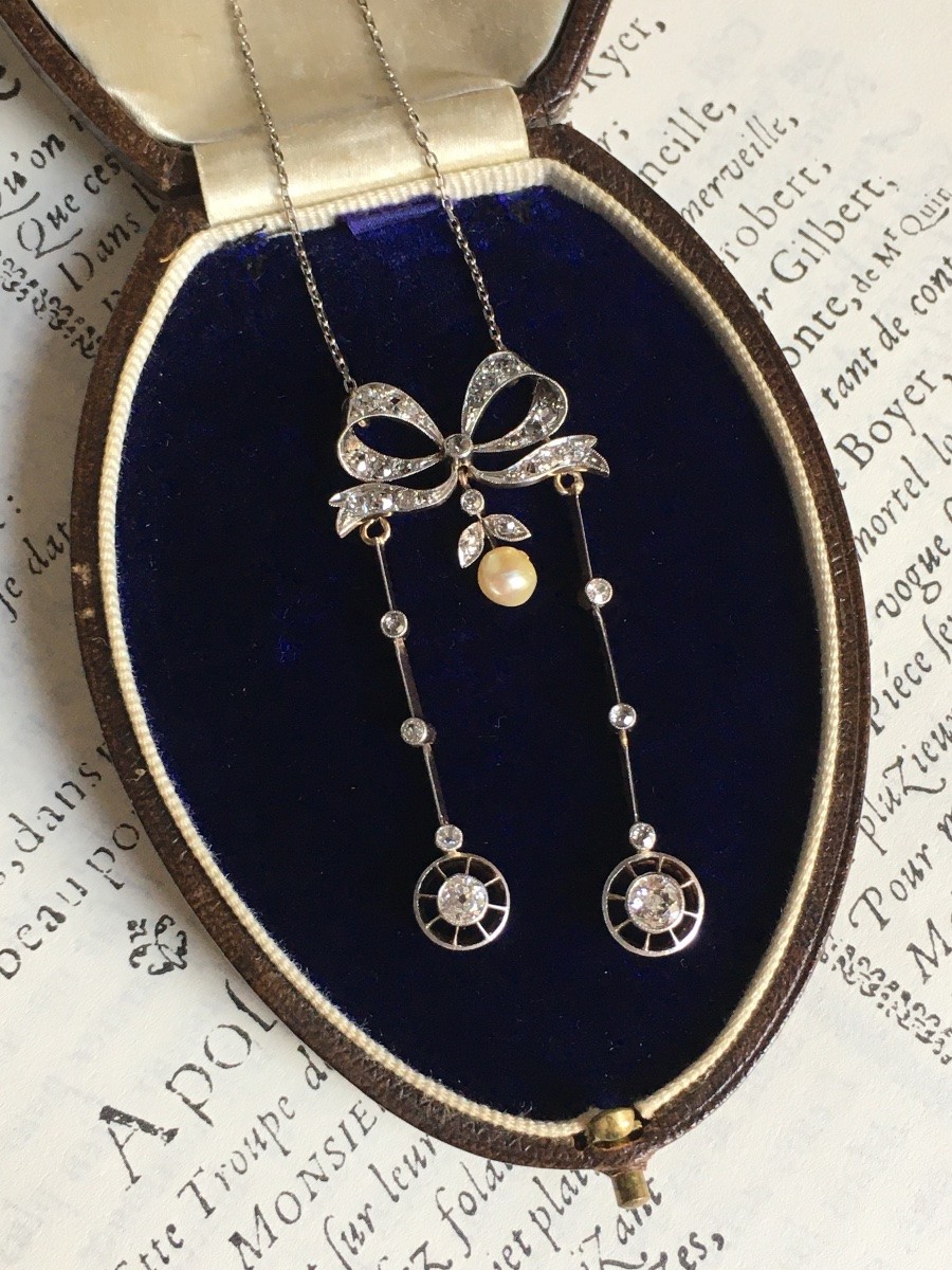 Collier négligé Belle Époque en or jaune 18K et platine, serti de diamants taille ancienne.