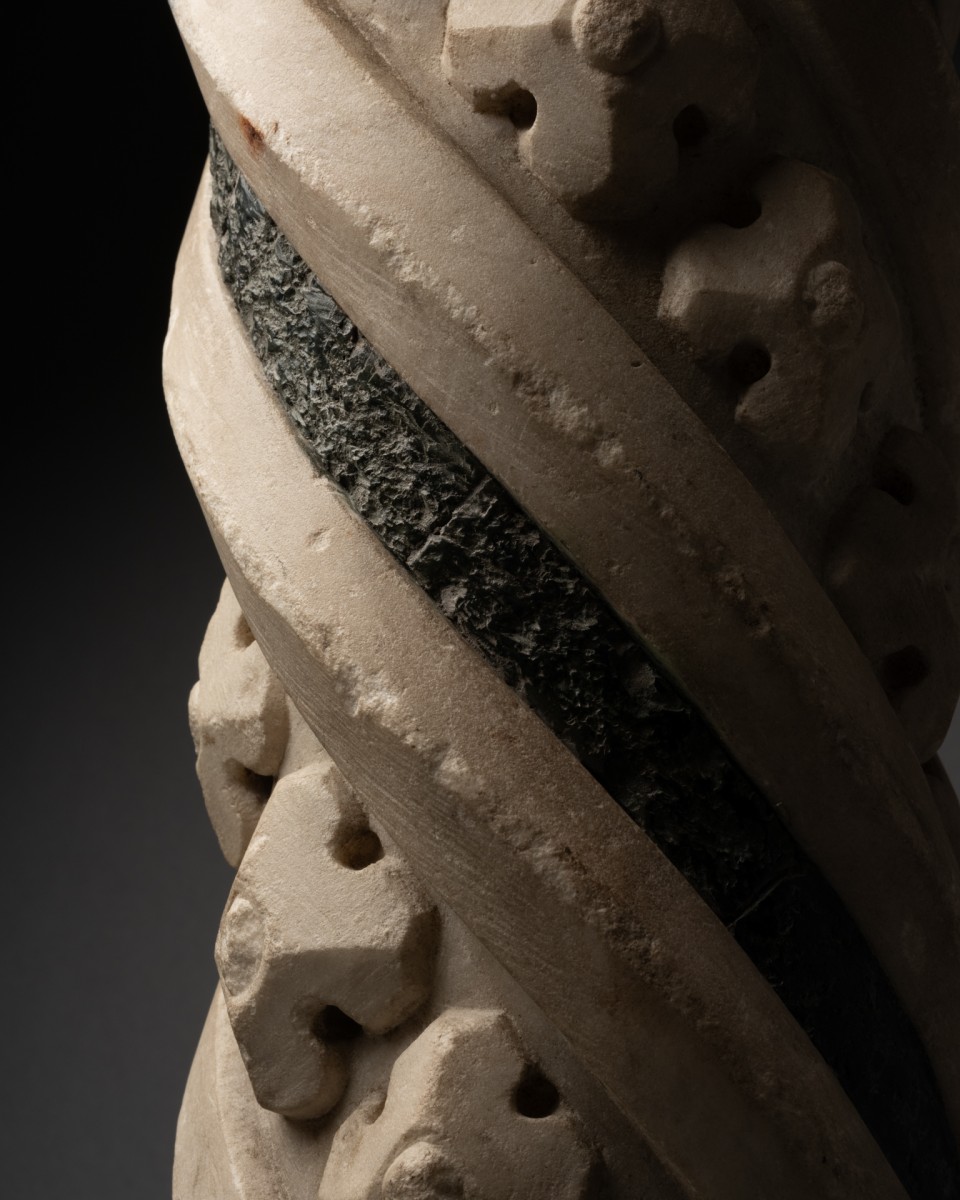 Ainsi, cette colonne torsadée, par la finesse de ses motifs, l’harmonie de ses matériaux et la sobriété de son profil, incarne un équilibre rare entre architecture, décor et symbolique religieuse. Elle témoigne de l’art sculptural italien de la fin du Moyen Âge et conserve toute la puissance évocatrice d’un art où le marbre blanc et le Verde di Prato, animés par la lumière, deviennent supports visibles de la foi et instruments de contemplation spirituelle.