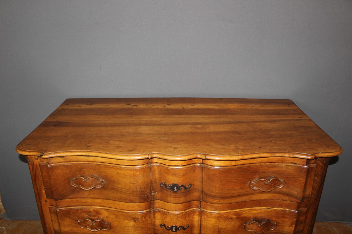 Commode en arbalète à trois tiroirs en noyer , entrées de serrures en fer d'origine , poignées de tirages en noyer sculpté dans la masse du tiroir d'origine , cotés en forme de chapelle , époque XVIIIe , finition cirée , ensemble en très bon état